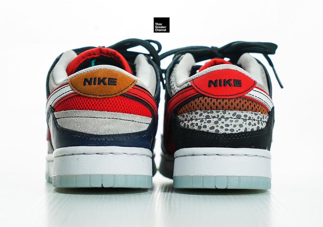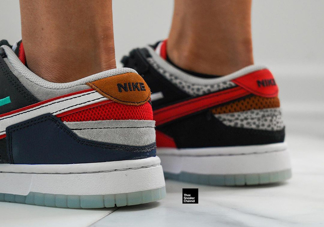 Looking closer, this Nike Dunk Low comes constructed with mesh, leather, and suede while dipped in White, Red, Navy, Grey, and Tan hues. Next, Safari print adorns the lateral side by the forefoot and heel while a White midsole and glow-in-the-dark outsole finish the look.