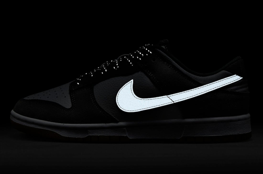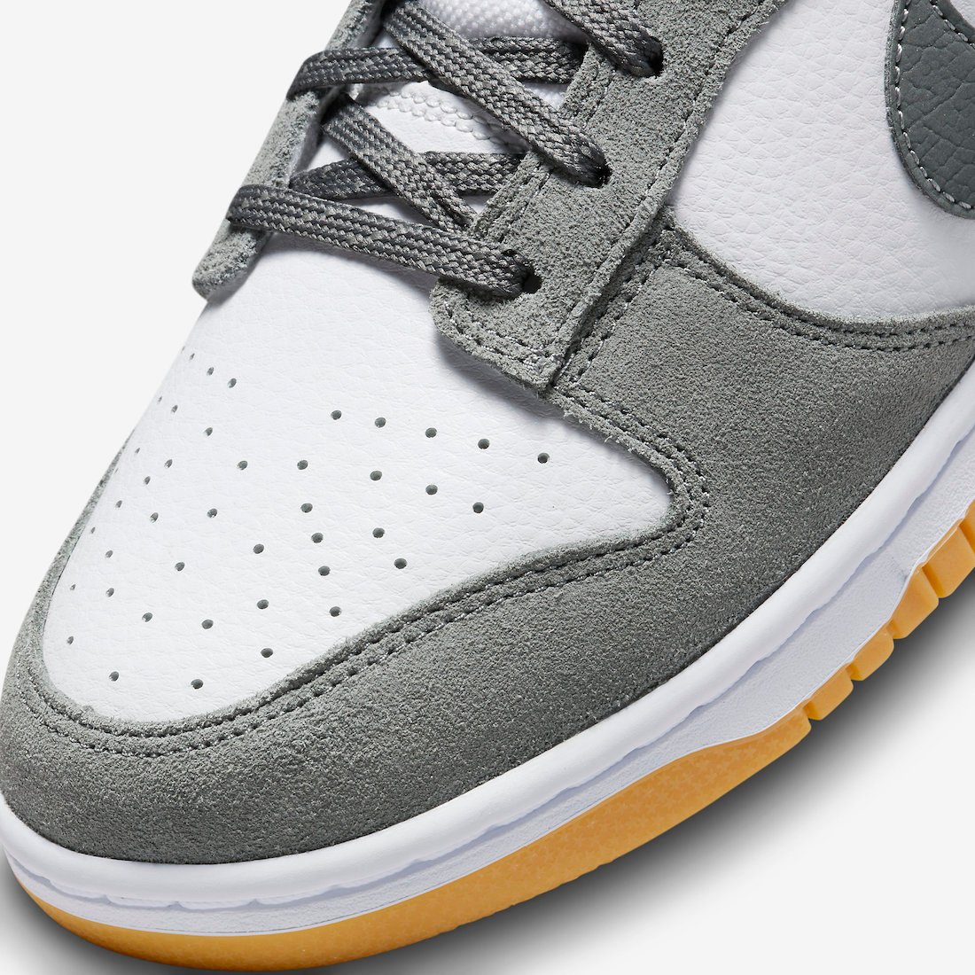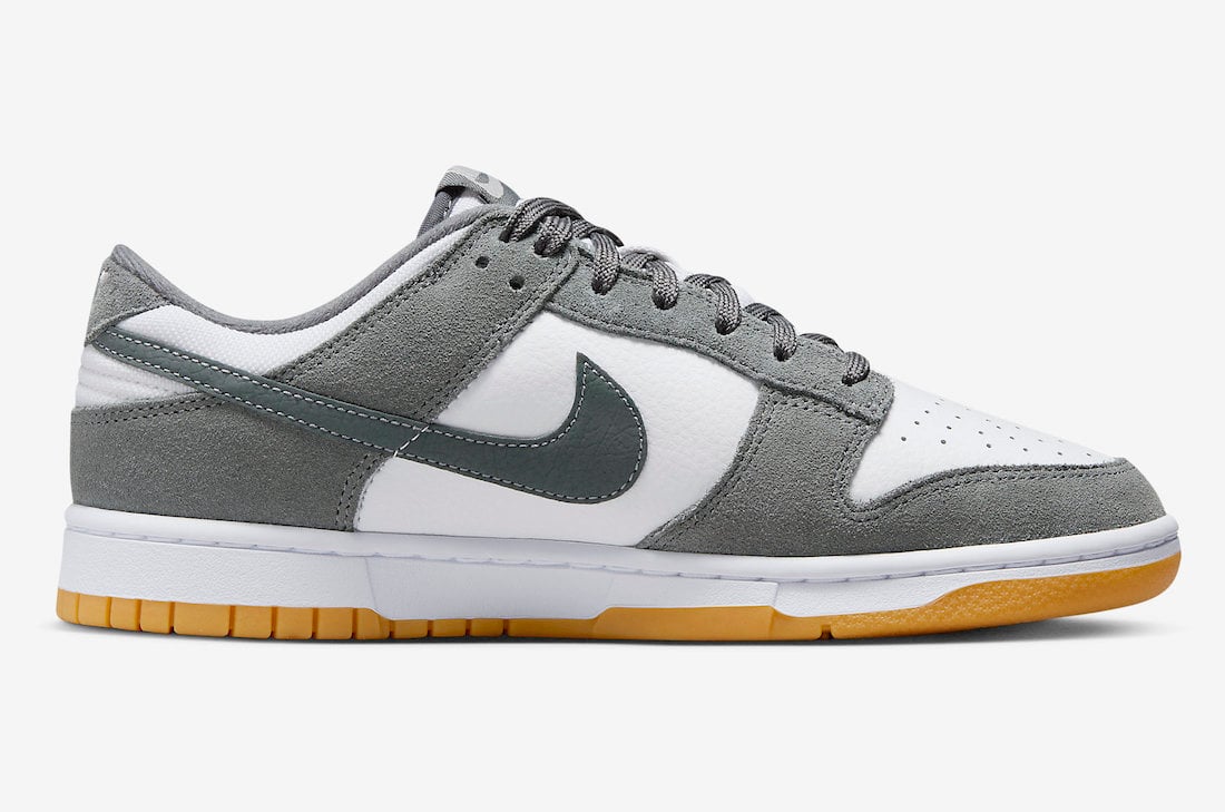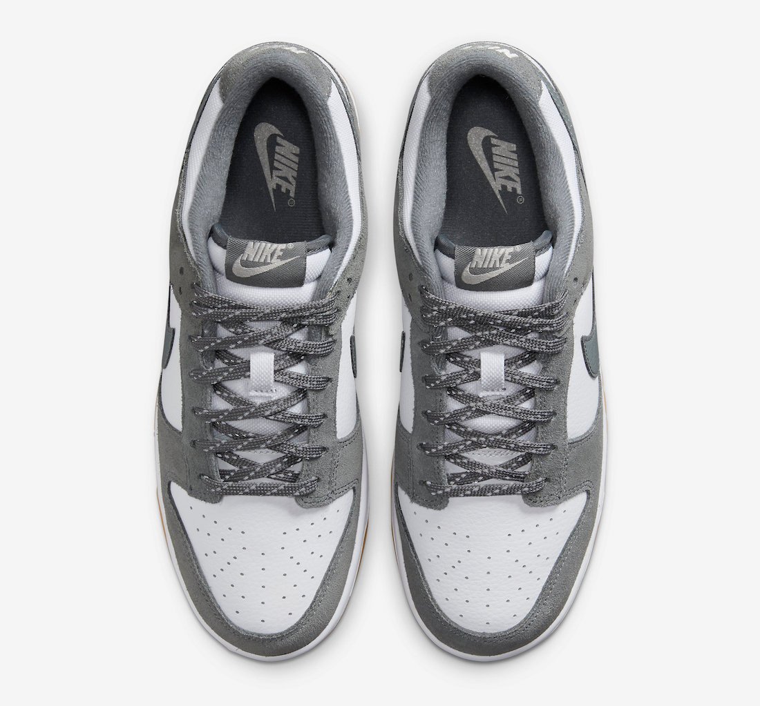 Going over the Nike Dunk Low, it sports a White, Smoke Grey, Light Iron Ore, Gum Light Brown, and Reflect Silver color combination. Highlighted with Smoke Grey suede on the overlays, heel tabs, and liner. Highlighting the shoes is leather 3M reflective Swoosh logos and tongue trimming in a darker shade of Grey. To further the look, speckled Reflective accents are applied to the Grey laces. Other details include White on the base and midsole with a Gum rubber outsole.