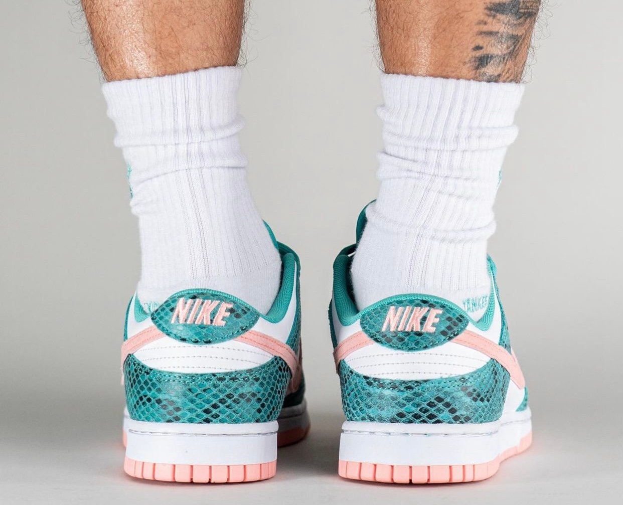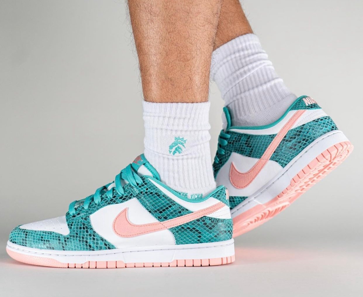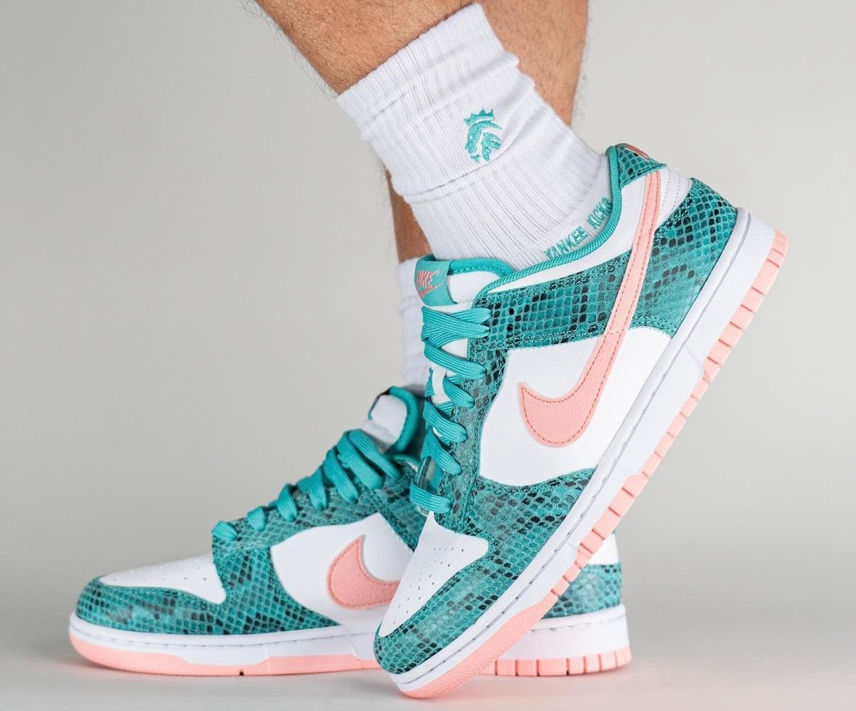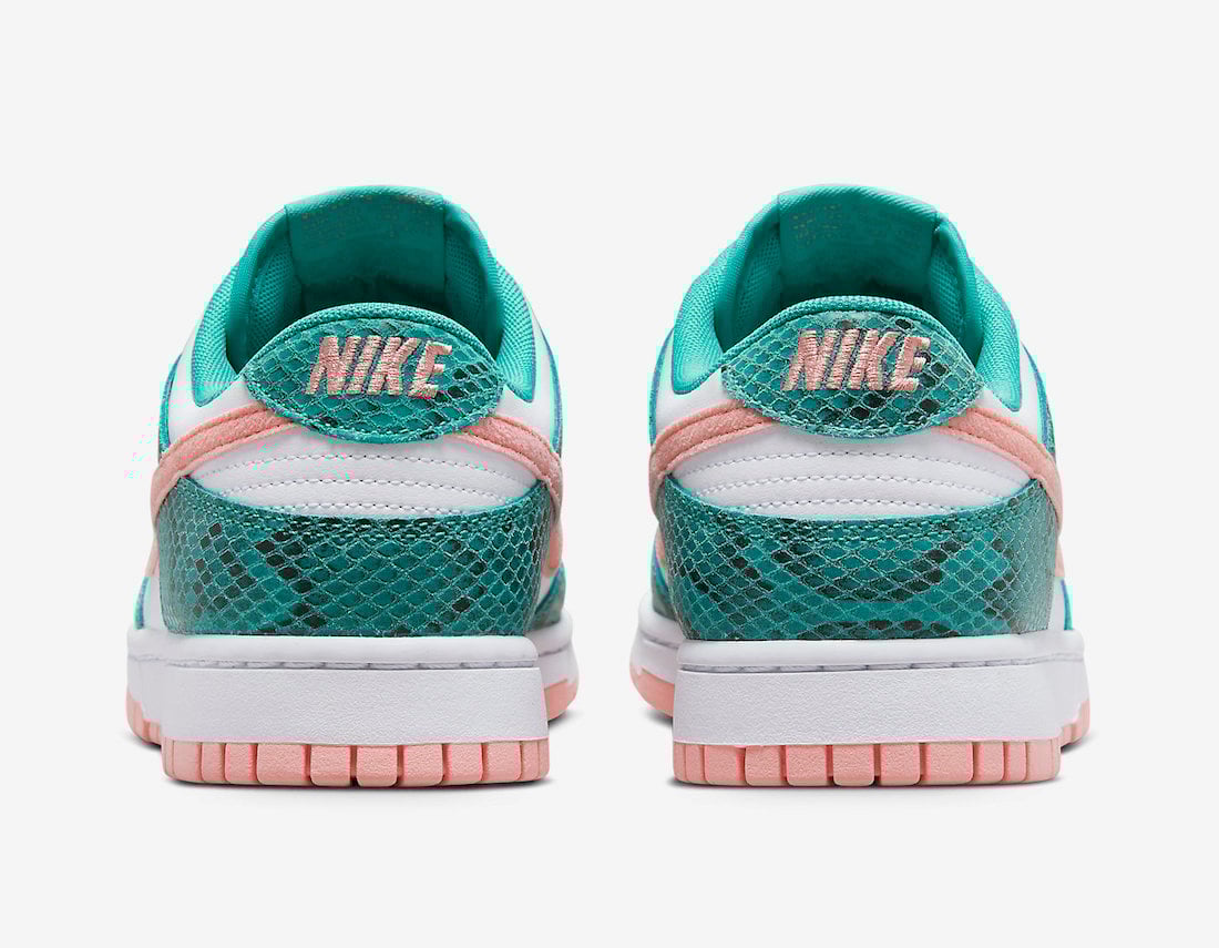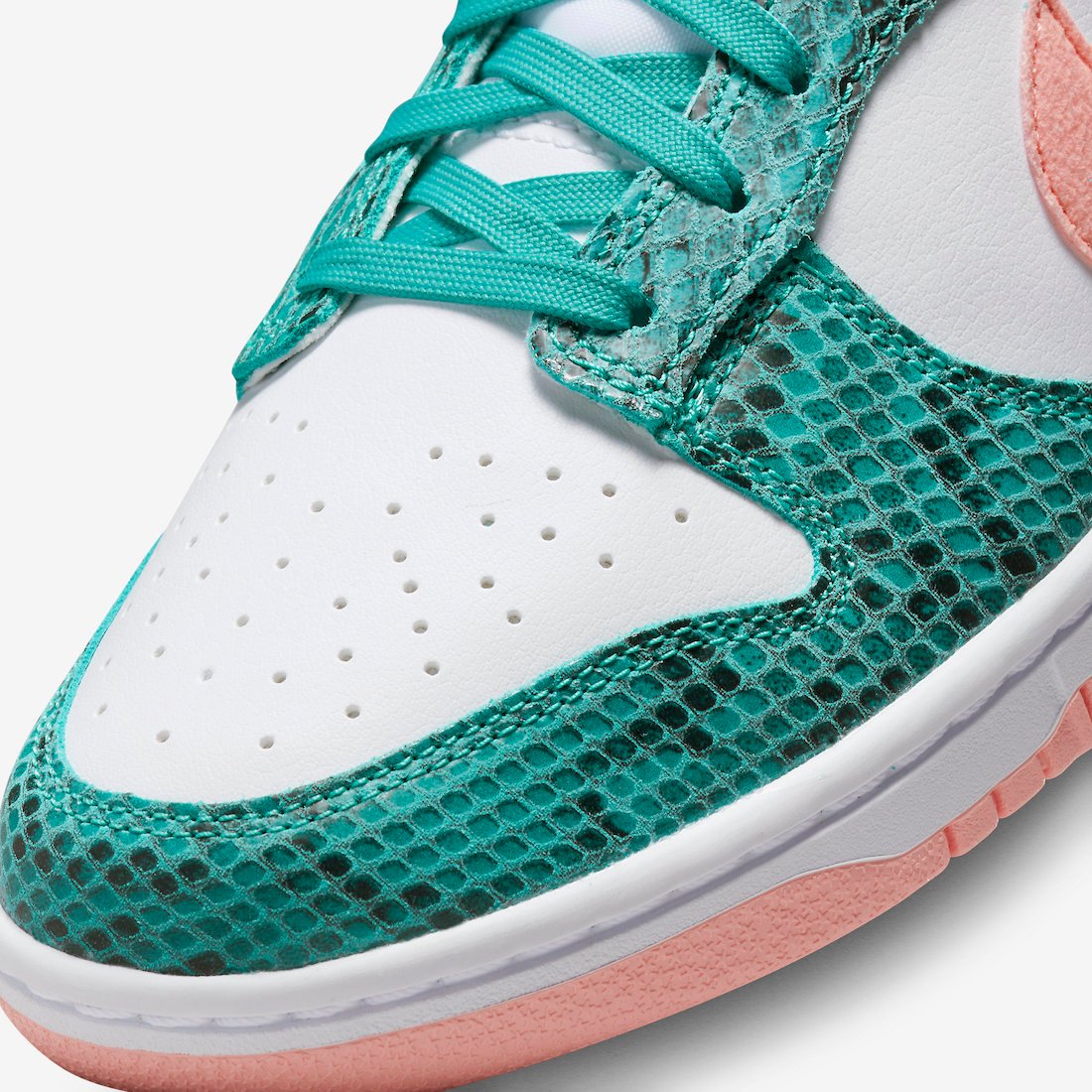 Going over this Nike Dunk Low, it features White leather on the base while Teal Green snakeskin print adorns the overlays ad heel. More teal appears on the laces, tongue label, and liner. Other details include Pink on the Swoosh logos, branding, and rubber outsole, while a White midsole completes the look.
