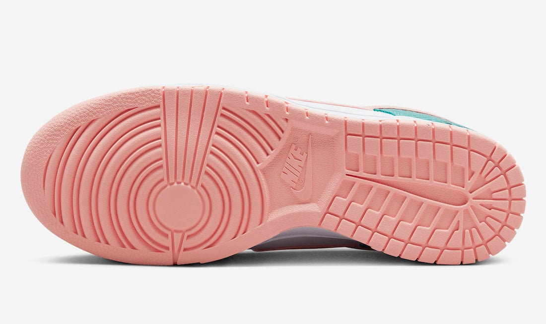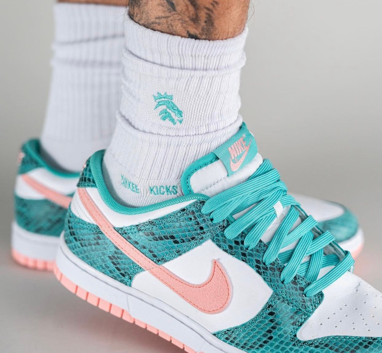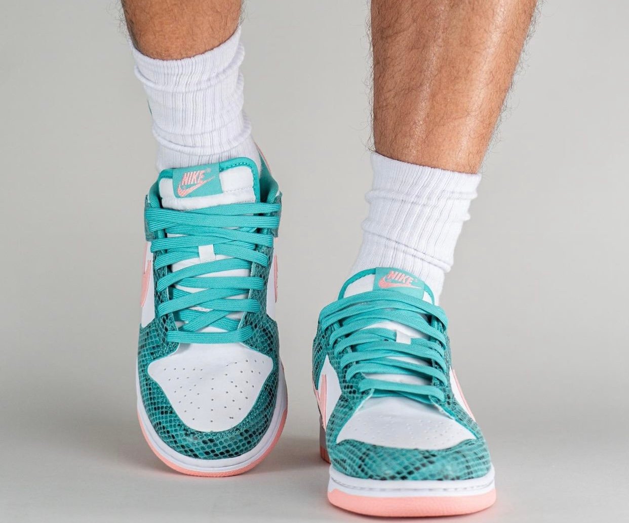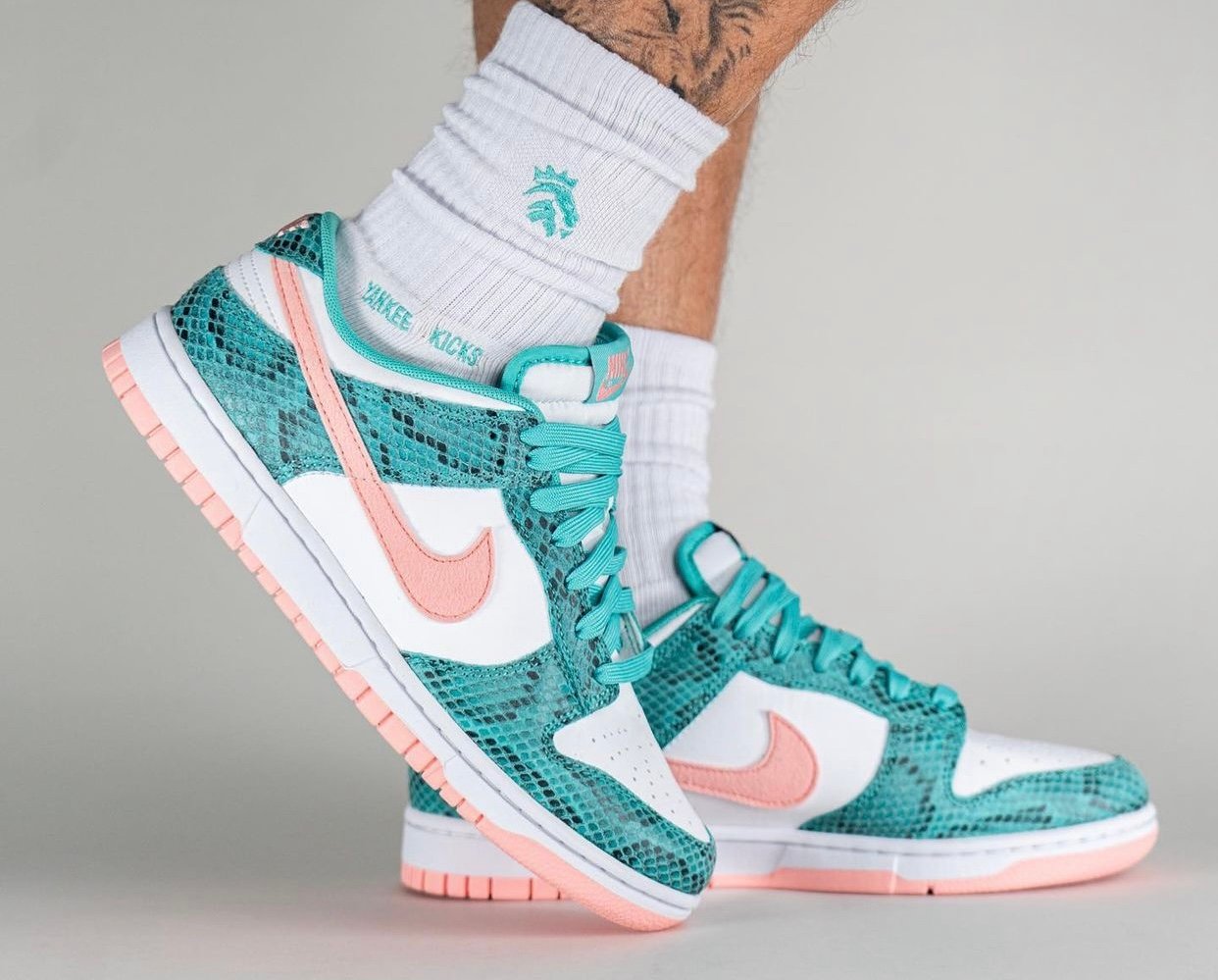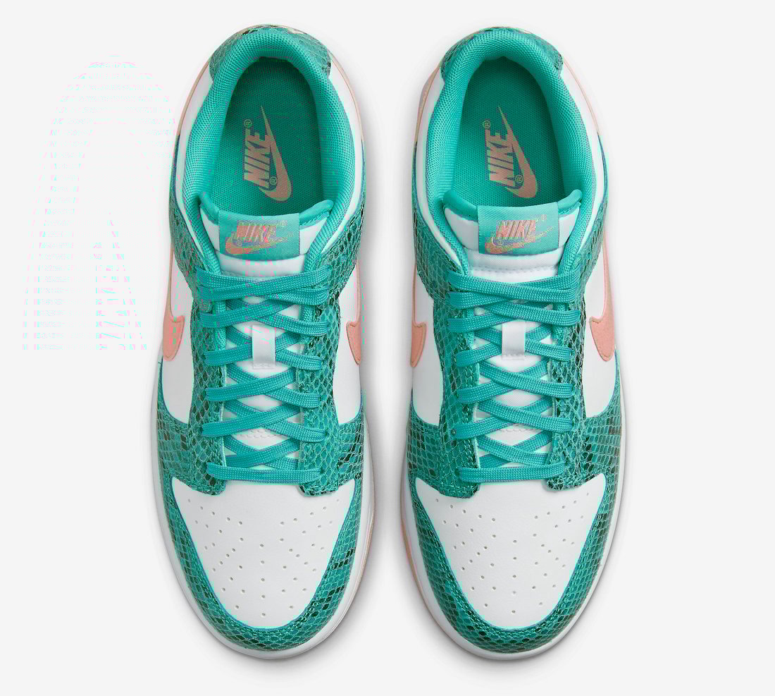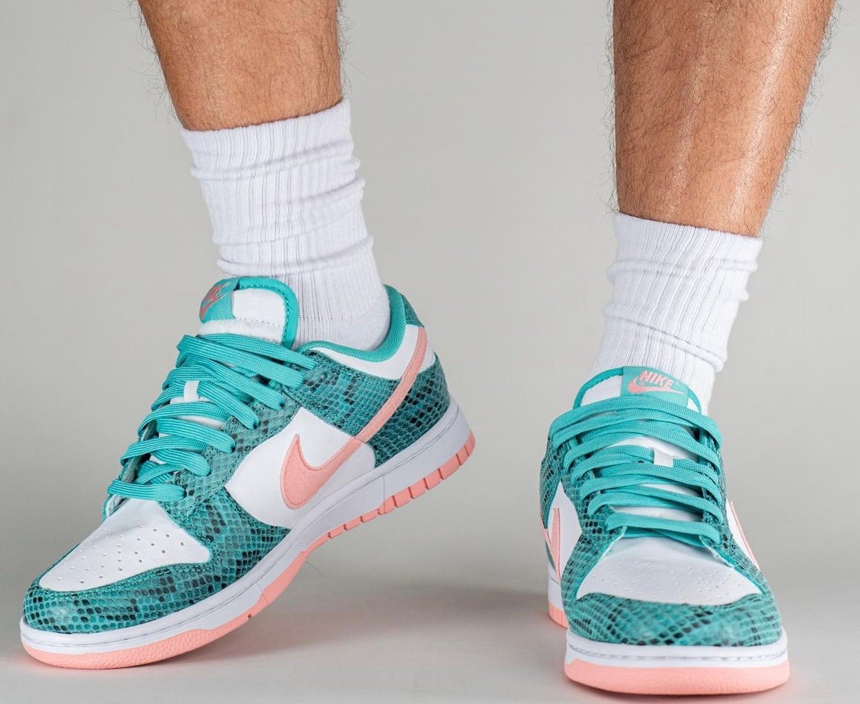 Going over this Nike Dunk Low, it features White leather on the base while Teal Green snakeskin print adorns the overlays ad heel. More teal appears on the laces, tongue label, and liner. Other details include Pink on the Swoosh logos, branding, and rubber outsole, while a White midsole completes the look.