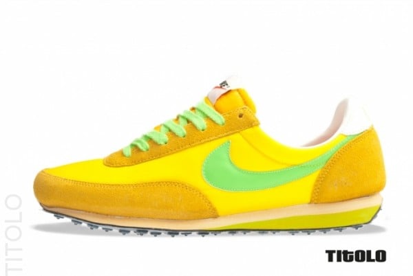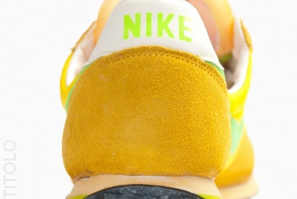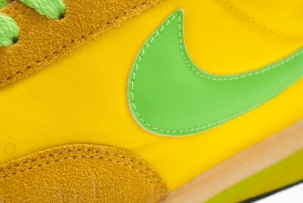 Decked out in yellow suede and nylon this time around, the kicks once again come with white leather lining, a matching heel tab, a yellowed midsole and a distressed black rubber outsole. Electric Green adorns the leather Swoosh, laces and heel tab branding.