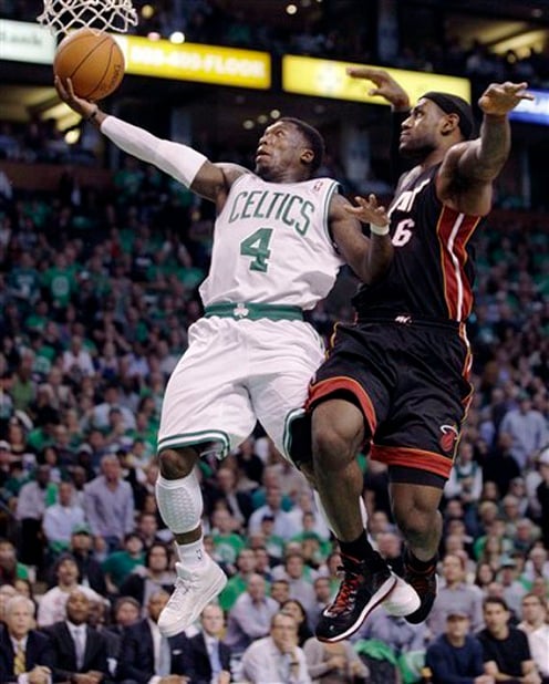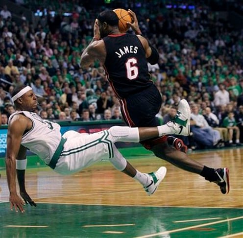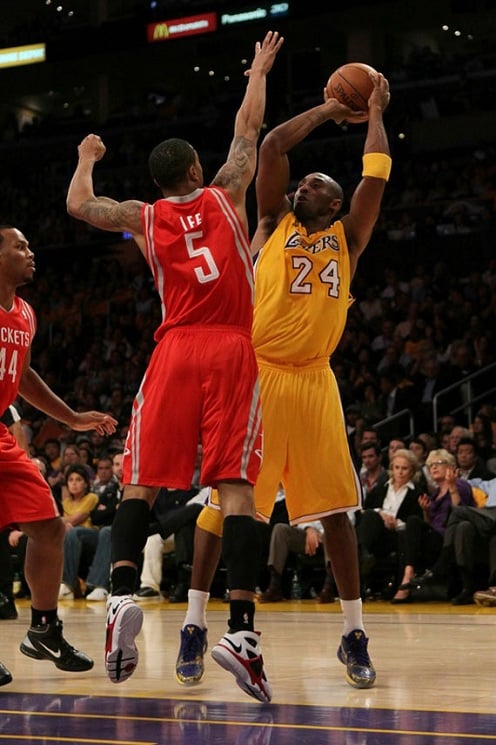 Yesterday marked the official release date of the black/sport red-gold Nike Air Max Lebron VIII and we brought you release information of the Nike Zoom Kobe V “Ring Ceremony.” Coincidentally, last night was also opening night for the NBA. If you watched, you were treated to two pretty close games between the Heat/Celtics and Rockets/Lakers. But sneakerheads probably also caught glimpses of what Lebron James and Kobe Bryant each had on their feet while going to work (31 points and 27 points, respectively). Check out the following action pictures and let us know how you think they look on court.