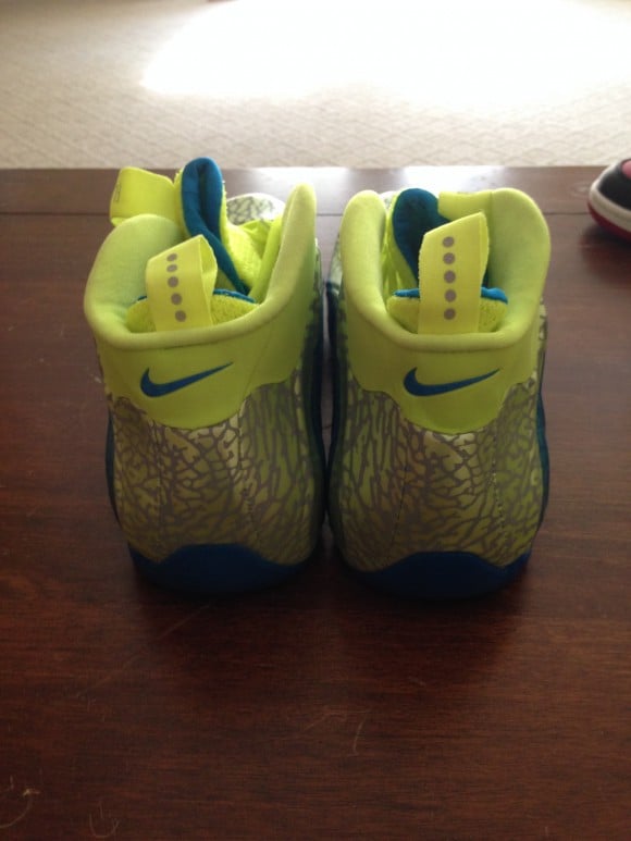 Having already shared a look at this upcoming pair of neon green/blue/grey Nike Flightposites, it looks like we’ve got some brand new shots to share with all of your sneaker viewing pleasures. Flush with a punchy mix of neon colors, the injection of the grey colored cracked cement-like graphic provides this colorway with both a tasteful boost in appeal along with a nice touch of balance. Read on after the jump to check out the new pics and be sure to keep rocking with SneakerFiles for more information.