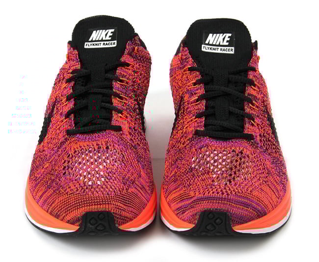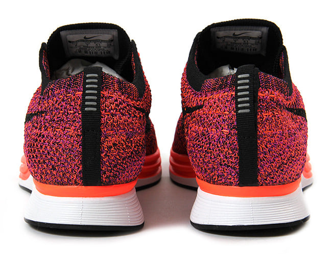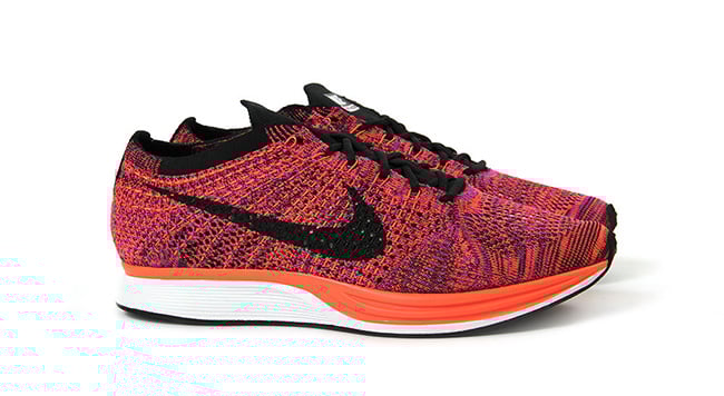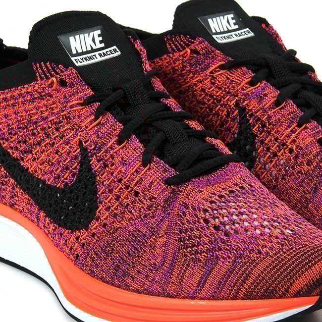 For those that love bright shades running through their Flyknit Racer’s, this pair doesn’t lack in the department. Featuring a mixture of purple, orange and pink through the base. Orange and white is used through the midsole while black fills in the swoosh, tongue and liner.