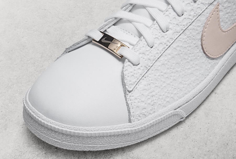These shoes feature a premium finish inspired by Nike Air Safari. Each style features metallic gold lace tips, deubrรฉs and a digitally printed rose gold Swoosh. They come with a Nike Flyleather logo patch and a Swoosh-engraved metallic gold โmedalโ.ย