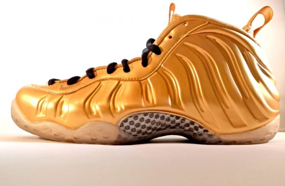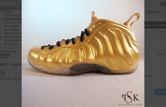 Inspired by the theory of alchemy, the creative minds over at Peculiar Kinetics whipped up this ill “Alchemist” Foamposite One custom. Fully equipped with a golden upper, the black laces add a nice level of balance fresh custom offering. Created with alchemy in mind, we can’t help picture these in the hands of Trinidad James. Continue reading after the jump to check out a few extra angles of Peculiar Kinetcs latest body of work and be sure to drop us a line in the comments section below.
