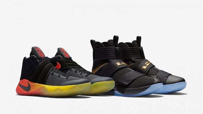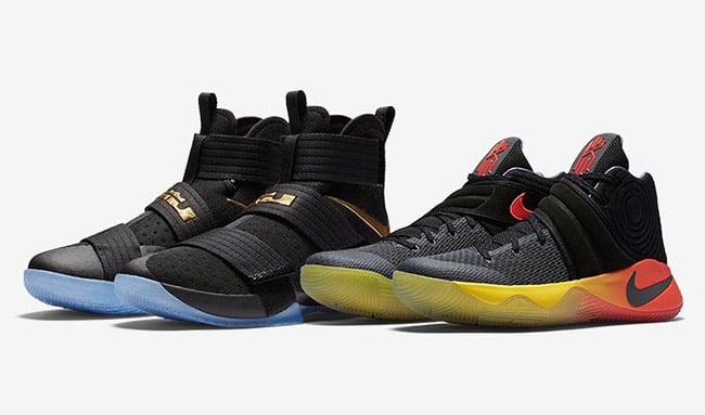 Including in the pack is the Nike Kyrie 2 and the Nike LeBron Soldier 10. Each of the color themes shown were worn by Irving and James in Game 3 of the NBA Finals. The LeBron Soldier 10 features predominate Black along with a translucent outsole. The Kyrie 2 uses White across the uppers, Red on the branding and Metallic Gold. Finishing the pair is also a translucent outsole.