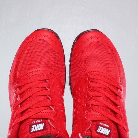 Draped in red, the kicks sit atop a Nike Free 5.0 Phylite sole for cushioning with white text branding on the tongue tab and a darker hit of red around the midsole.