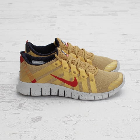 Sporting a Metallic Gold/Spirit Red look with navy blue accents, the gold medal-inspired Nike Free Powerlines+ NRG is now available alongside the Olympic rings colorway in-store at Cambridge’s Concepts for $115.