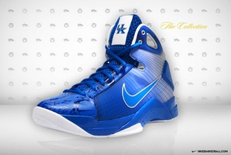 Our montage of Nike Hyperdunk University NCAA PEs continues today with this blue/white beauty made exclusively for Calipari’s boys. The shoe features clear Flywire and TPU at the heel, but gradually darkens and finishes in Kentucky blue at the toe. If you look close, you’ll notice that a ferocious wildcat logo is printed along the toe. As if John Wall and company needed any more help intimidating opponents. For now, this Nike Hyperdunk PE will remain exclusive to the University of Kentucky Men’s Basketball team.