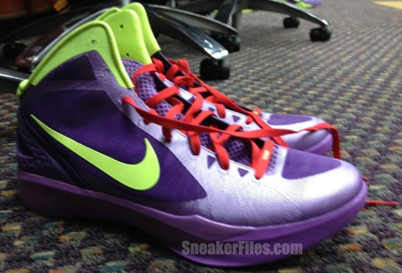 Done in the same scheme of the Kobe 7, the Pau Gasol Christmas Day Nike Hyperdunk 2011 features predominate purple uppers, lime green on the Nike logo and around the collar and red laces.