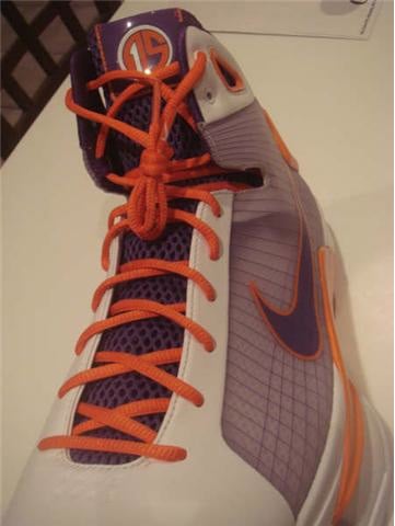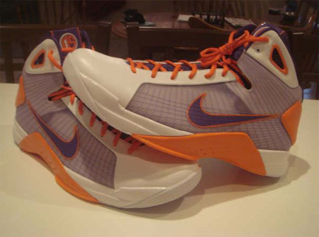 The Nike Hyperdunk has emerged as a prime choice for NBA athletes, as many have been photographed wearing the popular basketball sneakers. Phoenix Suns’ All-Star, Amare Stoudamire is the latest athlete to receive a Player Exclusive Hyperdunk. The model pictured above has Stoudemire’s number on the tongue and is in contrast to the Suns home colors; White, purple and orange. No word yet regarding a general store release. Viaย Niketalk.