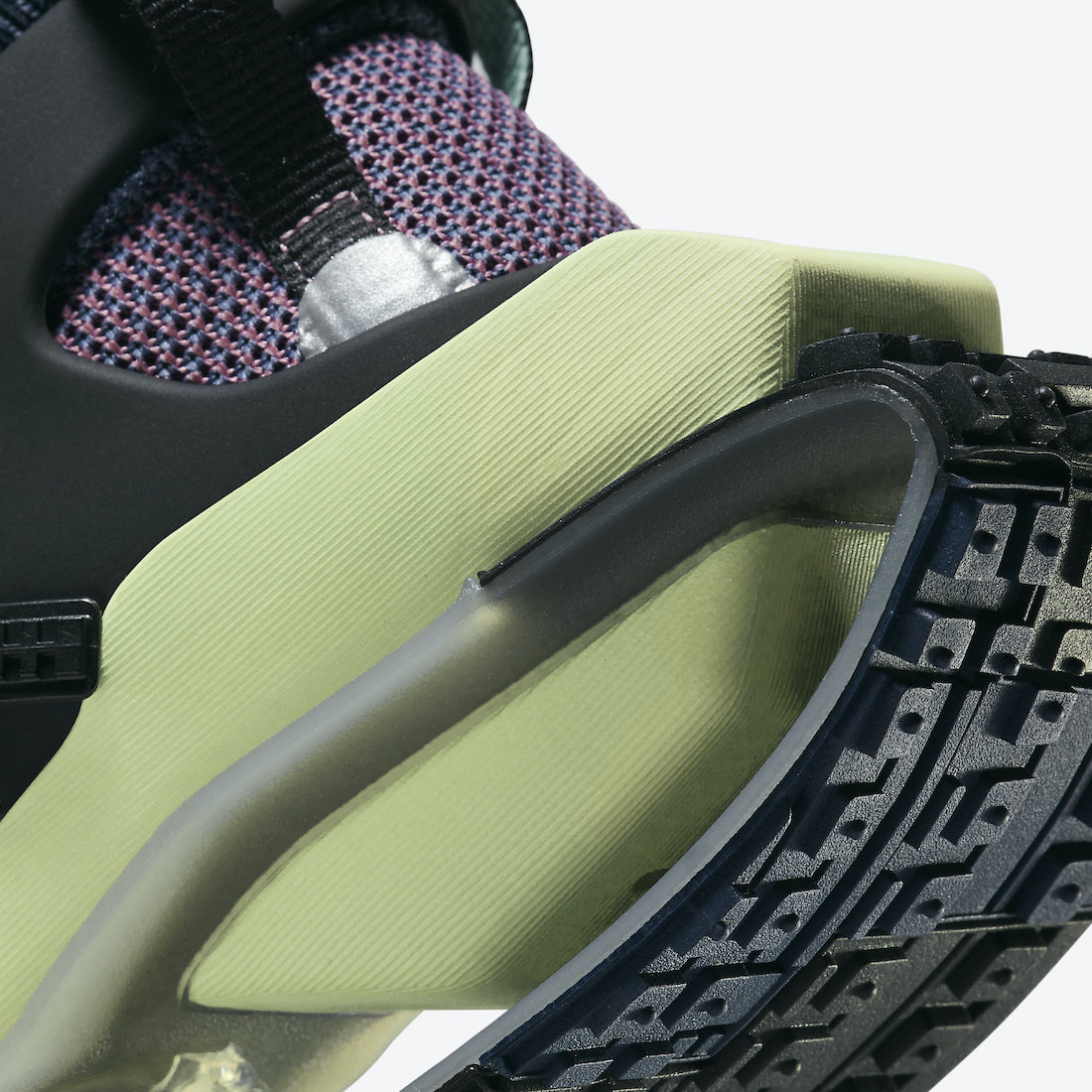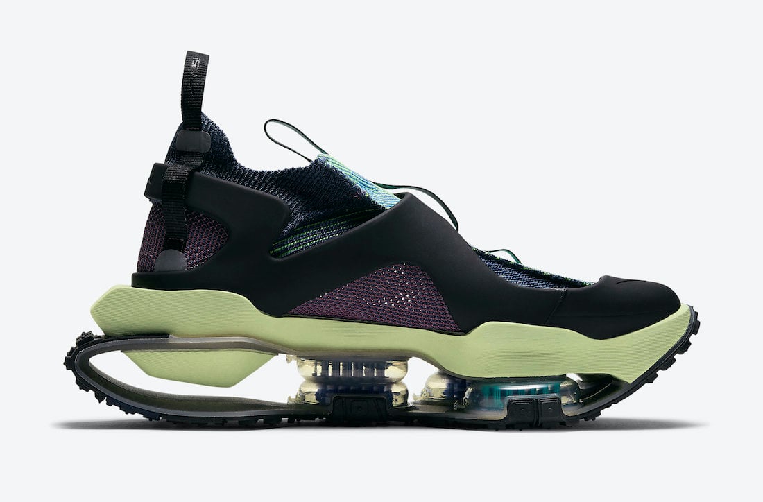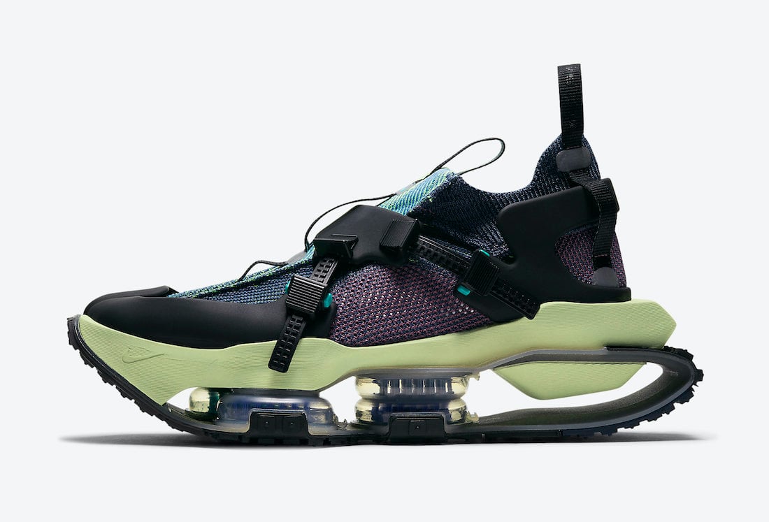Going over this pair it comes dressed in a Black, Purple and Green Glow color combination. This ISPA Road Warrior comes with a knit-patched upper while having a rubber cage overlay along with buckles and straps. In addition we have a double stacked Air Zoom pods in the forefoot along with an open floating heel. For the midsole, Nike reimagined the Japanese tabi work boot and added a split-toe design.