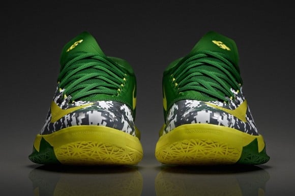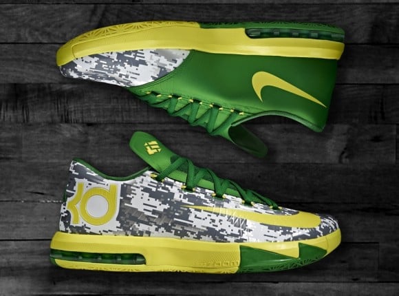 Looks like the Oregon PE train has picked up even more momentum. Since sharing a few looks at the “Ducks” Air Jordan V PE, two new pairs of exclusive Oregon kicks have surfaced. Fully equipped with a camo upper, both the Nike KD VI and Hyperdunk 2013 PE’s were created for the sole purpose of being worn during the Ducks game against Georgetown on November 8th. Today, we have a detailed look at the previously mentioned KD VI. From the detailed angles below, all of you sneakerheads will get to see the digital camo led kicks in all of their PE glory before they arrive in South Korea for the Armed Forces Classic game. Check out all the photos after the jump and be sure to keep your browsers locked to SneakerFiles for more information.