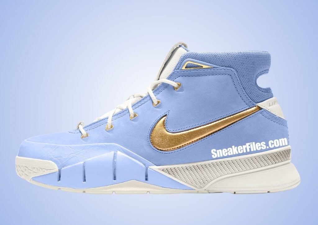 This Nike Kobe 1 is dressed in Work Blue, Summit White, and Metallic Gold. The image used is a mock-up, and what releases may differ. However, from the official description, it says this pair will have “City of Champions.” We are speculating here, but the pair could be a new MPLS colorway. The shoes are expected to feature Work Blue throughout, with Summit White and Metallic Gold accents. Furthermore, the shoes will have all of the signature Kobe branding.