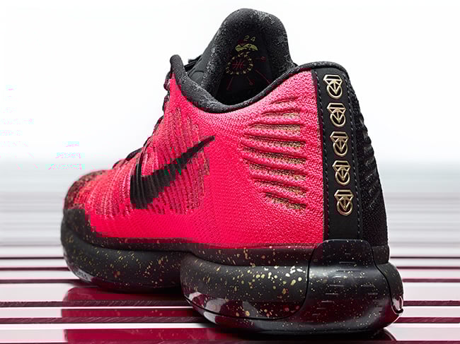 The Kobe 10 edition is apart of the fire series and goes a bit deeper than the other models. Using a bright crimson Flyknit upper to represent fire while the lateral side is done in black. The two shades then mix it up on the toe box. Following is metallic gold landing on the swoosh, tongue branding and the five championship rings on the heel. The last detail is a compass with a basketball and his number 24 on the inside of the tongue.