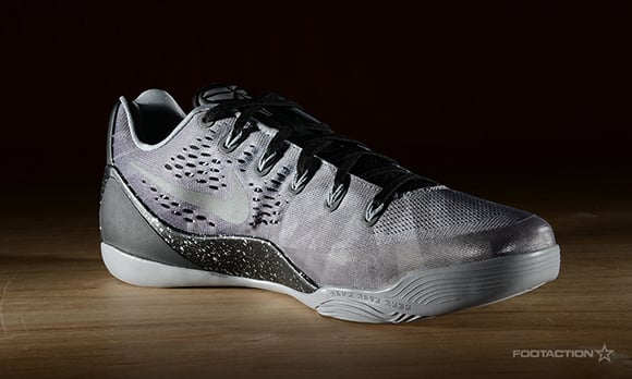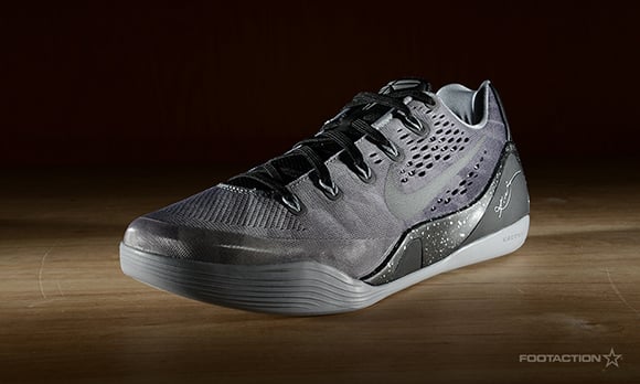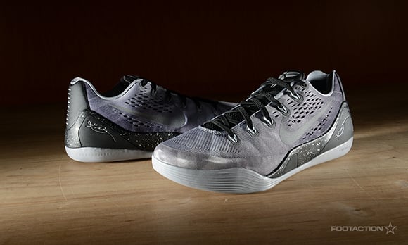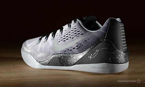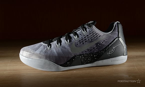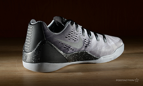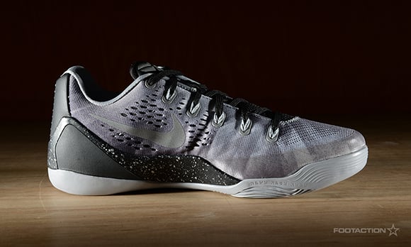 Known simply as the Metallic Silver Nike Kobe 9 EM, which utilizes a black mesh upper which has a gradient finish to smoke grey. Black is on the midsole along with white speckles. Last but not least is the grey outsole and sole.