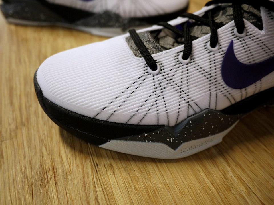 Seen here in a white/black-gold-purple colorway, the kicks pair a white TPU upper with texturized black leather, gold lining, a grey external heel counter, speckled grey midsole and purple accents on the Swoosh branding and Black Mamba logo.
