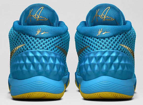 The Nike Kyrie 1 GS features current blue dressed on the uppers while imperial blue lands on the tongue, part of the midsole and liner. For additional pop the brand added tour yellow on the outsole and and laces but the finishing touches come in the form of metallic gold coin which is used on the swoosh, Kyrie’s signature and branding on and within the tongue and heel.