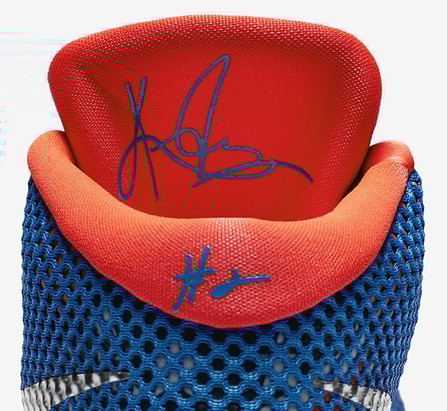 The USA Nike Kyrie 1 features blue through the mesh uppers, metallic blue on the heel counter and obsidian on the tongue and laces. The midsole is filled in with white, red hits the outsole, sole and liner. Last but not least is metallic silver which is used for the Swoosh and Kyrie branding on the tongue.