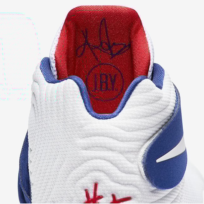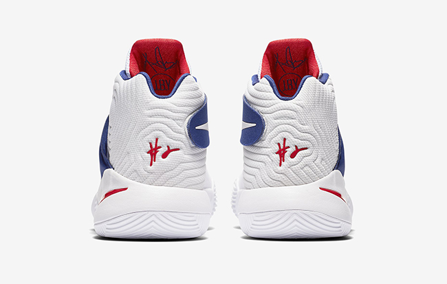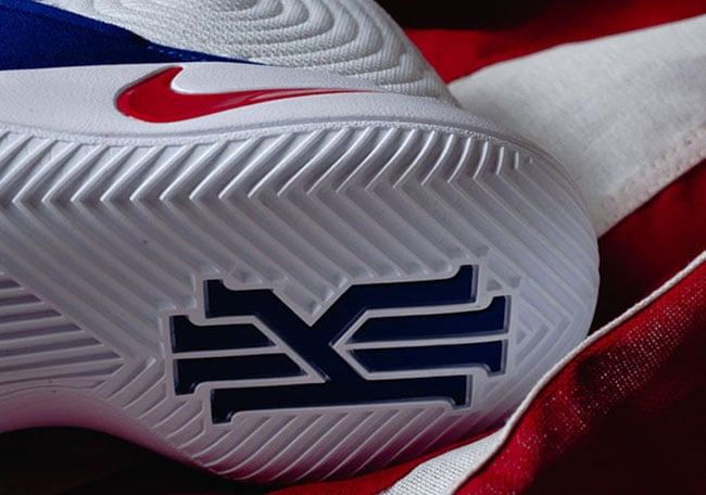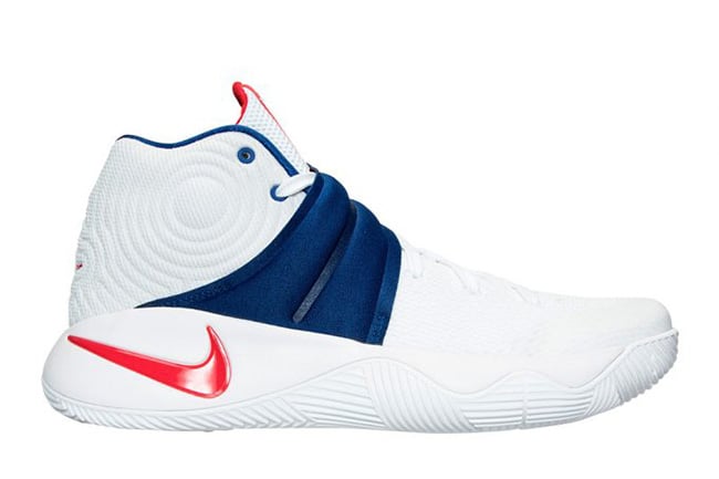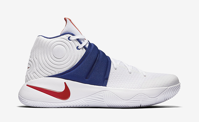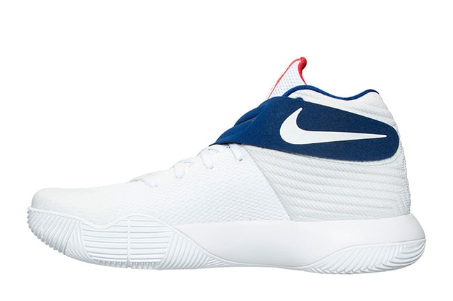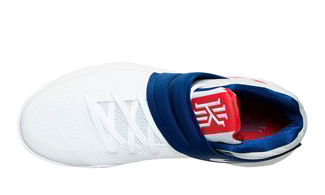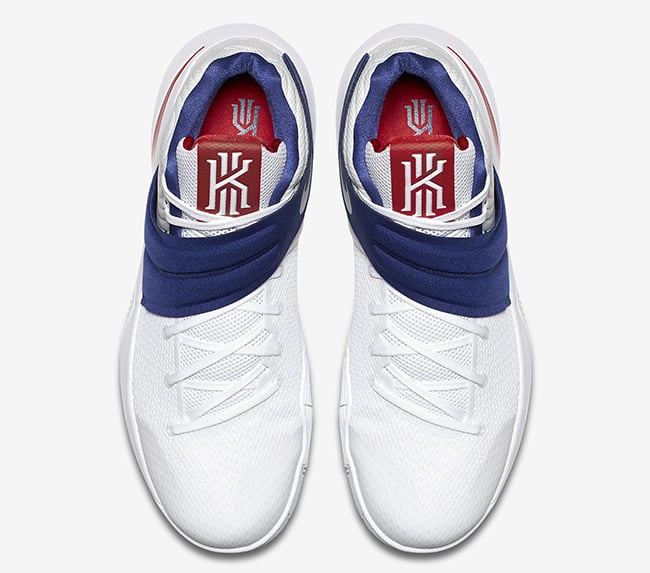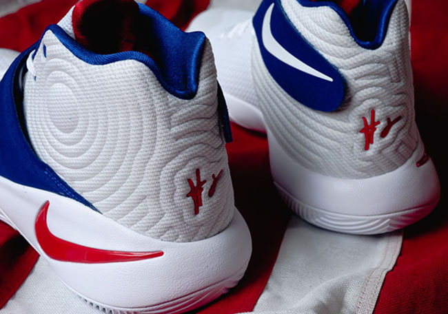 As you can see, this Nike Kyrie 2 features a USA theme of White, University Red and Deep Royal Blue. Looking closer, Nike used a White mesh with minimal hits of fused on the uppers while Blue lands on the cross strap, liner and top eyelets. Completing the look is Red which is placed on the Nike Swoosh, top of the tongue and branding on the heel.