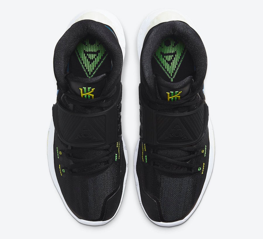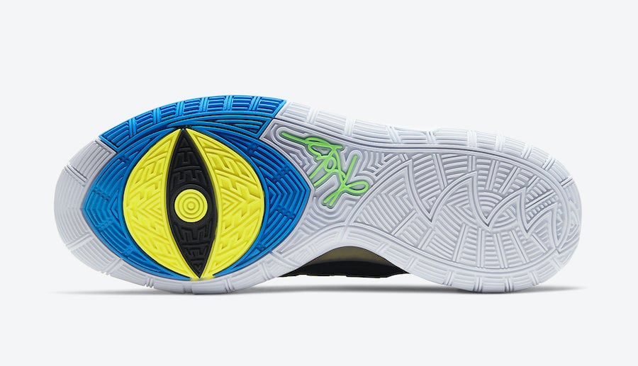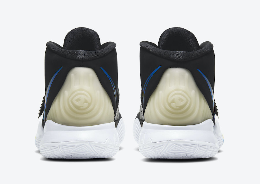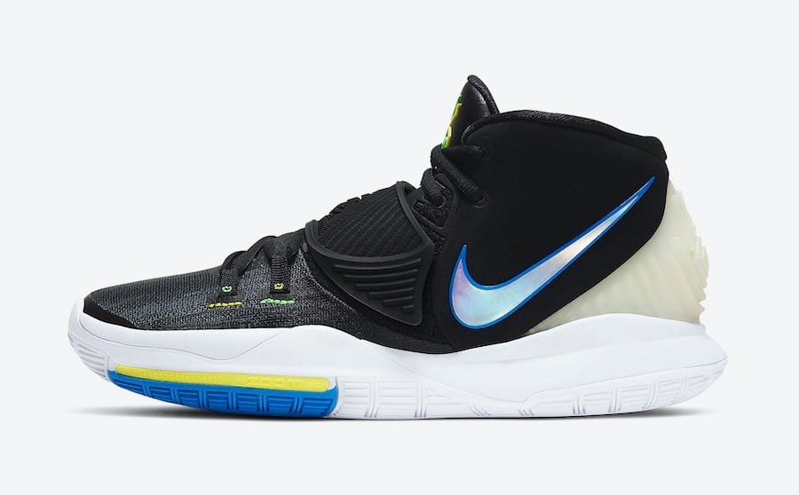 Featuring a Black, White, Soar and Dynamic Yellow color combination. This Nike Kyrie 6 comes with Black across the base while Yellow and Blue accents are spread throughout. In addition we have Iridescent on the Swoosh logos, glow in the dark on the heel and a White midsole which completes the look.