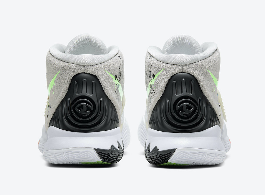 This Nike Kyrie 6 comes dressed in a Photon Dust and Green Strike color combination. Constructed with the traditional engineered mesh across the upper while glow-in-the-dark detailing lands on the mid-foot strap. Green lands on the Swoosh across the panels which mimics slime and then we have โThere Is No Coming Backโ text on the lateral side by the heel. We also have a unique basketball logo on the right tongue while a White midsole and rubber outsole that includes Orange and Green detailing completes the look.