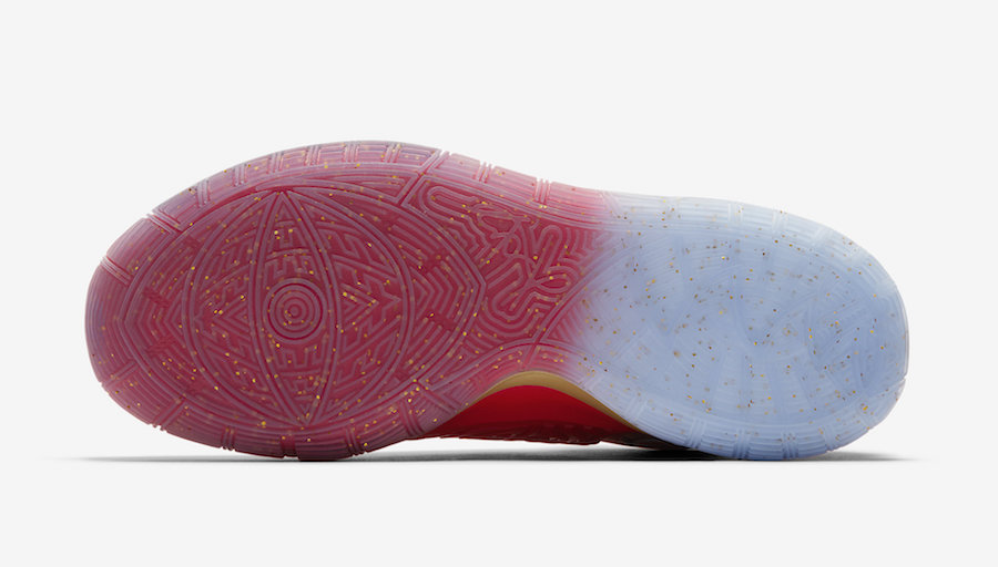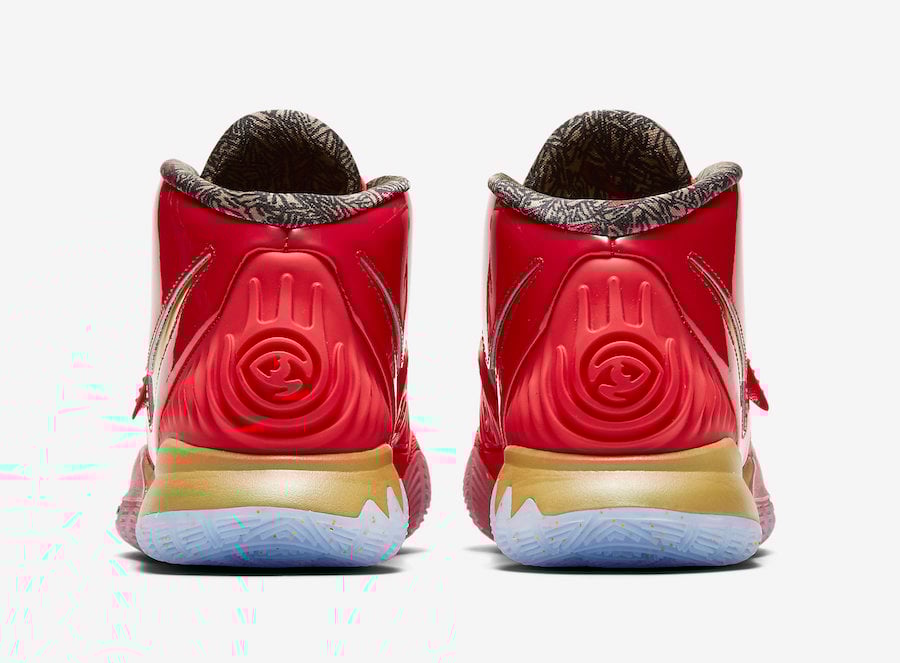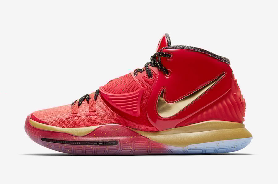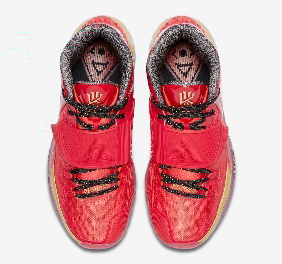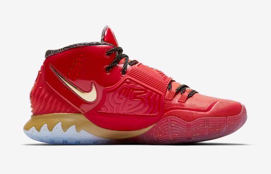 Looking closer this Nike Kyrie 6 features Red across the upper as well as the cross strap along with Gold and Black accents. Following we have a translucent outsole while 06/16/96 text lands on the lower tongue of the right shoe and 06/19/16 on the left which is a tribute to Irvingโs NBA Championship. Other highlights includes a graphic on the liner resembling the carpet that MJ laid on crying after winning his first NBA title after loosing his father.