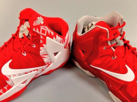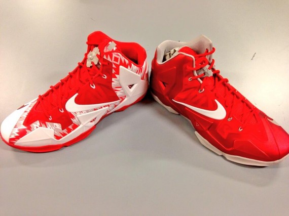 Even though LeBron didn’t go to college, his sneakers has been making their rounds when it comes to the collegiate hardwood. Joining the list of schools to flaunt some PE LeBron XIs are the Ohio State Buckeyes. Pictured after the jump is a look at both a white/red and all red pairs of the previously mentioned silhouette. With one sporting a jagged graphic about its upper, the other goes for more of a tonal appeal. Continue reading to check out another look and be sure to let us know where these rank amongst your favorite pairs of PE kicks.