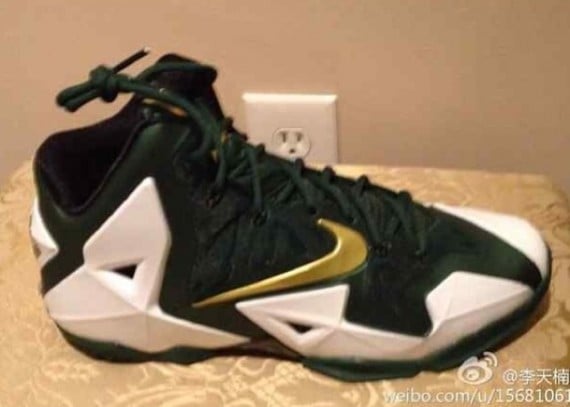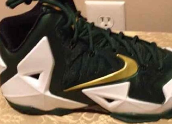 Two days ago, we shared a look at the “SVSM Away” Nike LeBron XI PE. Today, we have our first look at the home iteration. Sporting a crisp green base, the Fighting Irish team colors again occupy the shoes accents, As you will see below, hearty touches of white and gold lay claim to the models key design sections. Peep another quick look at this latest SVSM PE and be sure to drop us a line in the comments section below.