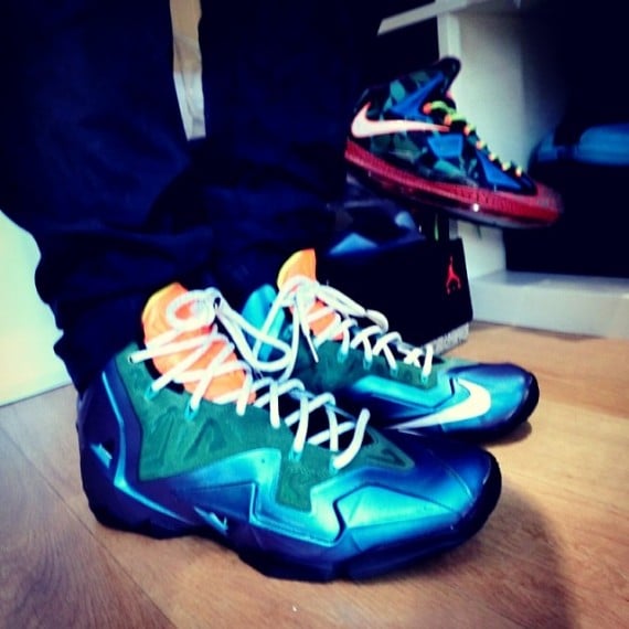 Before it made its initial arrival on the sneaker scene, the Nike LeBron XI went through its fair share of design changes and tweaks. During the creative process, plenty of samples are created until the creative minds agree on one solid design and use that as the shoes actual retail offering. Pictured after the jump is a look at a Swooshless sample version of LeBron’s eleventh signature shoe. As you will see from the photos, the larger tiled Swoosh on the lateral side is missing while the smaller medial Swoosh remains. Check out another look after the jump and be sure to drop us a line in the comments section below.