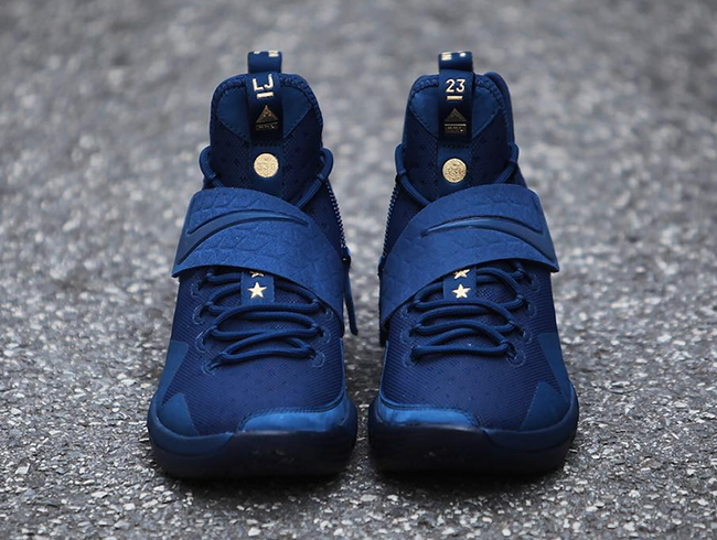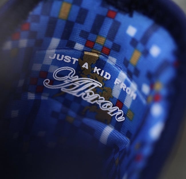 This Nike LeBron 14 comes dressed in a Dark Blue and Gold color combination. Down the tongue is special symbols which pays tribute to LeBron James and the connection to the Philippines. Following we have a graphic on the liner which is inspired by woven fabrics that are found in the Philippines.
