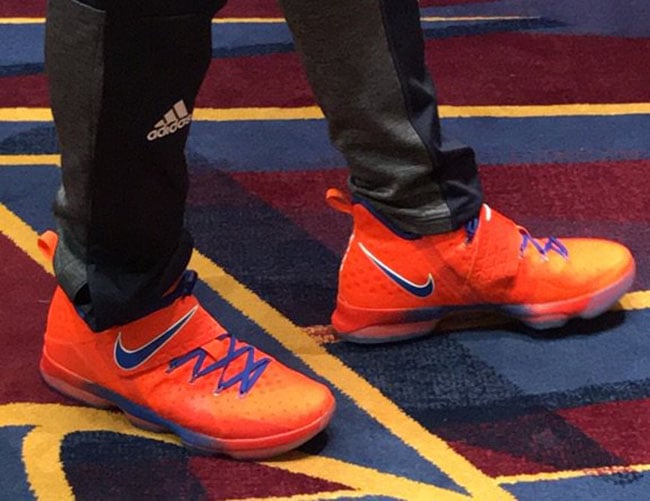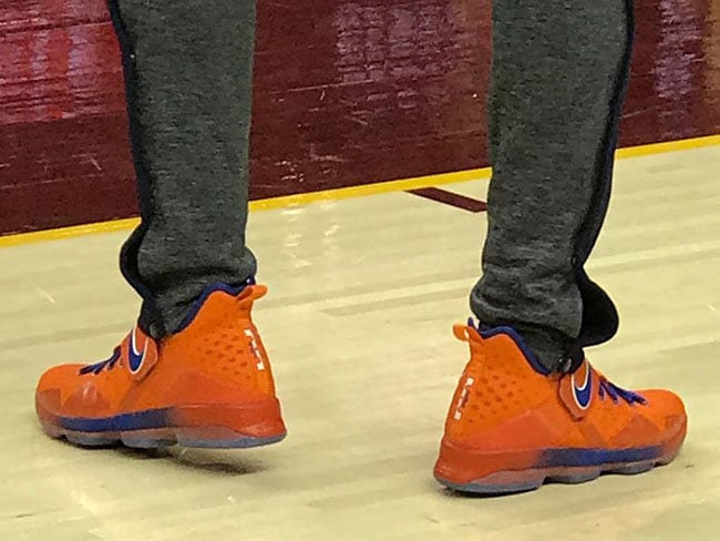 Matching the throwback theme, this Nike LeBron 14 features Orange and Blue which resembles the Hardwood Classics look. As you can see, the base comes in predominate Orange while also landing on the strap. Following is Blue that is applied to the liner, Nike Swoosh, laces and gradients across the midsole. Completing the look is a gradient translucent outsole.