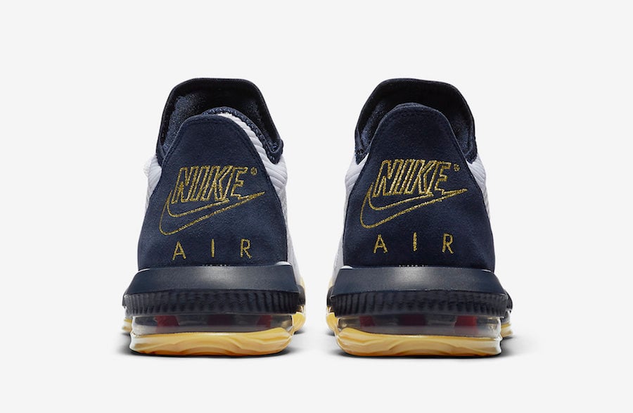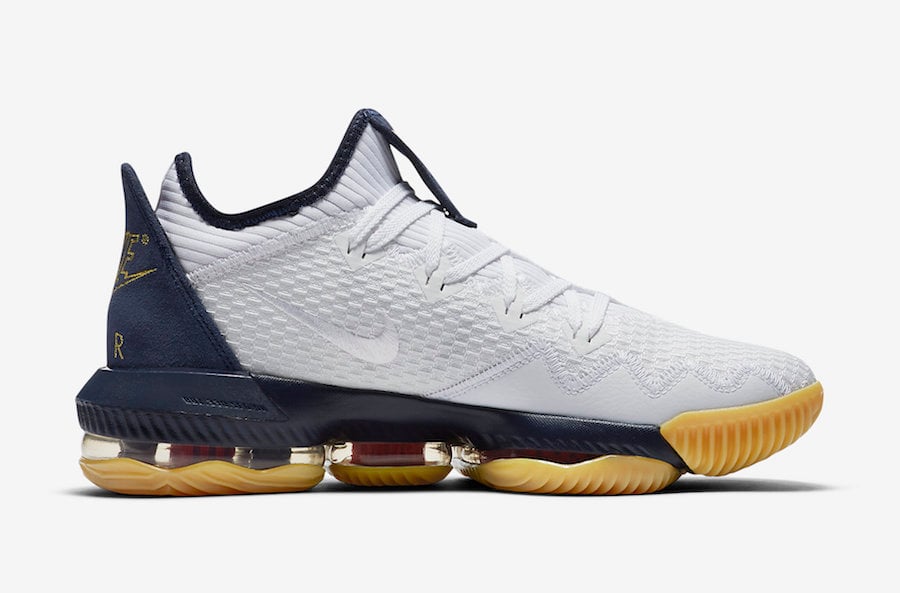 This low version of the Nike LeBron 16 comes dressed in a White, Metallic Gold and Midnight Navy color combination. Highlighted with White knitting across the upper while Navy hits the tongue, liner, heel, insole and midsole. Following we have Metallic Gold on the branding with Red accents. Other details includes USA flags hidden on the back heel tabs and a Gum rubber outsole.