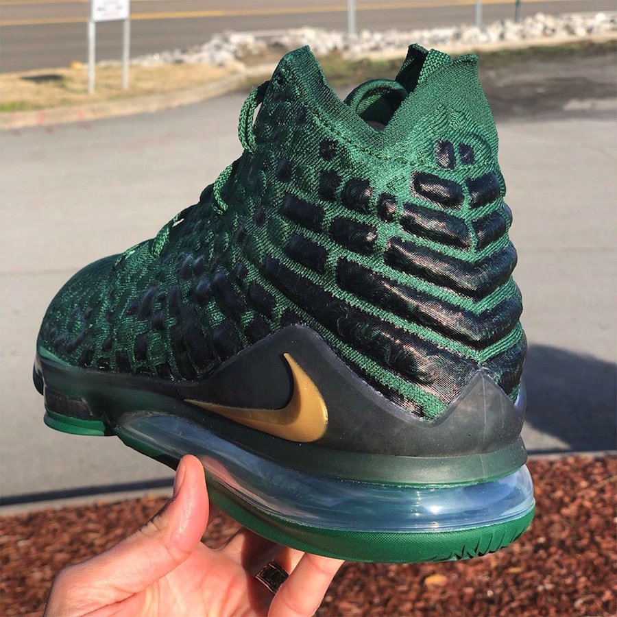 Looking closer, the โHomeโ edition of the Nike LeBron 17 features a White knitted upper while Green accents are used. In addition we have a smokey translucent heel counter while Green covers the midsole and White runs across the rubber outsole. As for the โAwayโ, it features Green across the upper while Dark Green detailing is spread throughout. Also utilizing a smokey translucent heel counter while a Green midsole and rubber outsole completes the look. The two will also come with Gold on the branding and SVSM Fighting Irish logos land on the tongues.