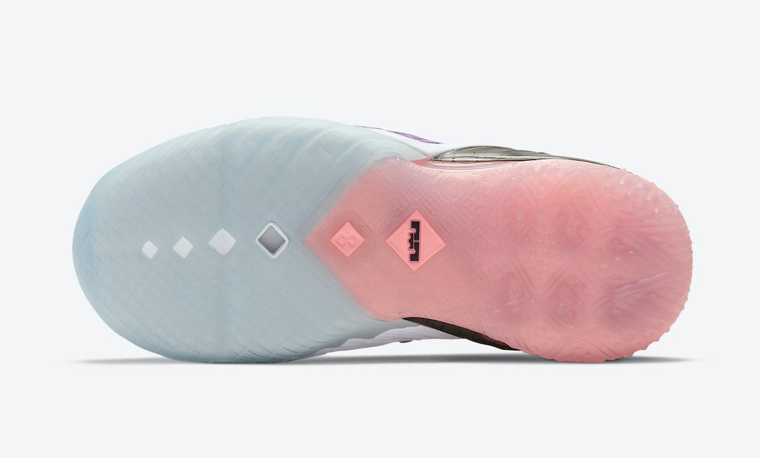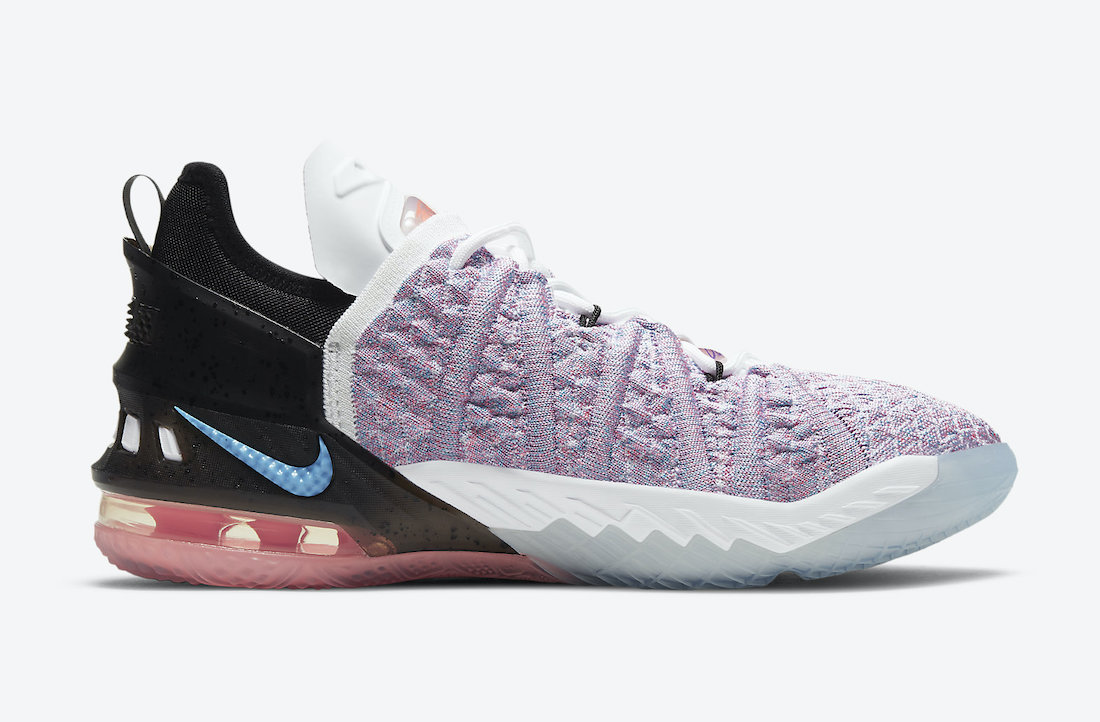 As you can see, this Nike LeBron 18 comes highlighted in Purple, Pink, and Blue accents throughout. Next, Flyknit adorns the upper while White appears on the tongue, laces, and midsole. Black then lands on the mini embroidered Swoosh on the toe and heel while Chlorine Blue lands on the Swoosh across the medial heel. Lastly, we have โJAMES GANGโ text on the insoles and a translucent outsole.