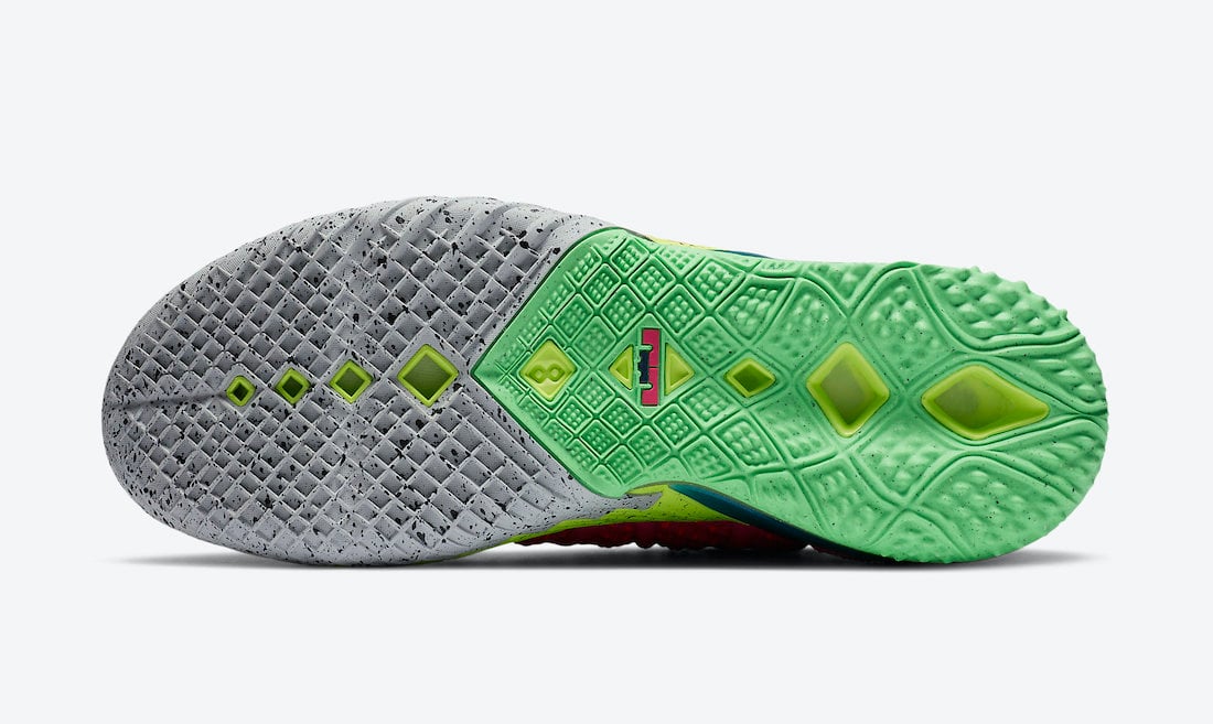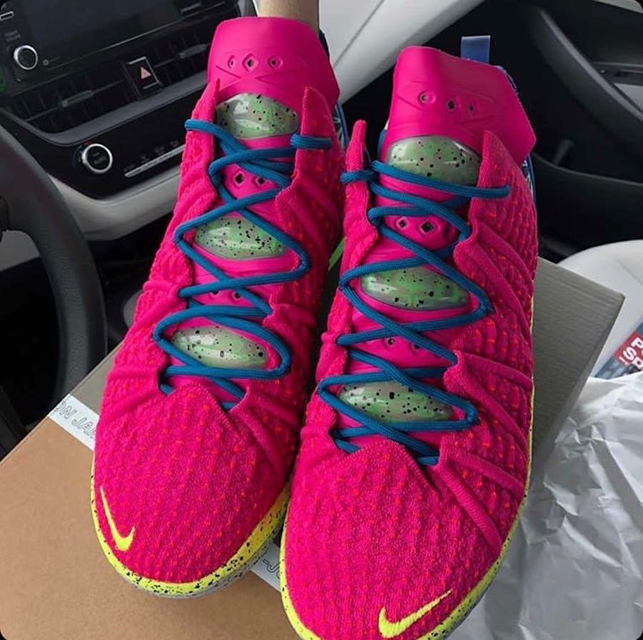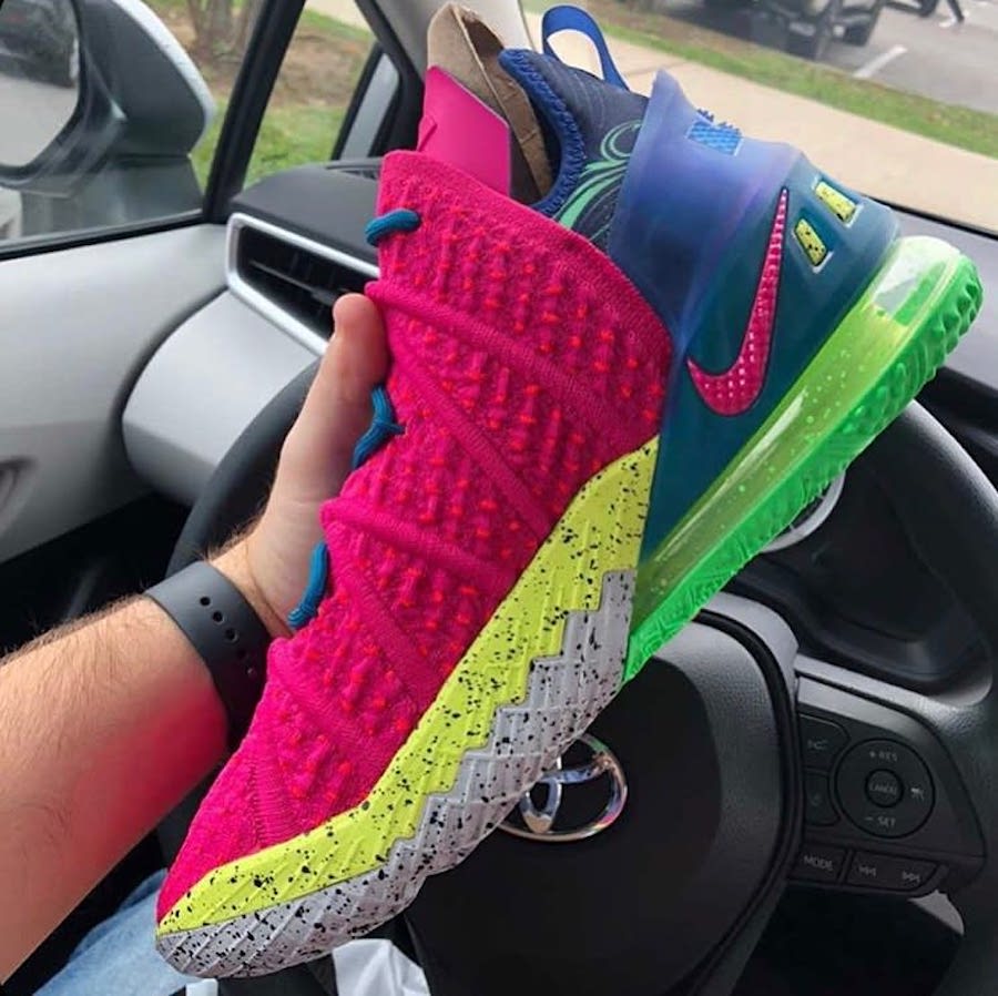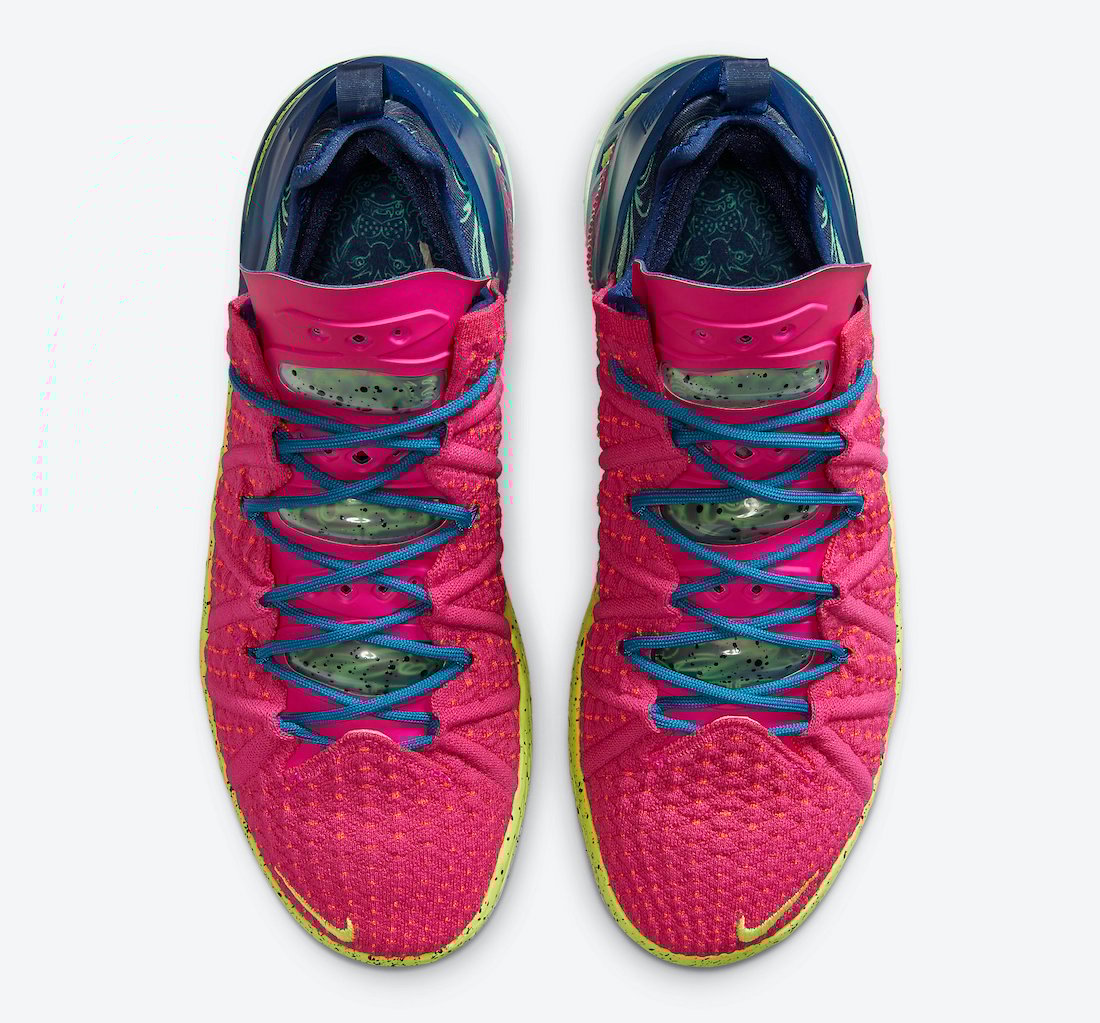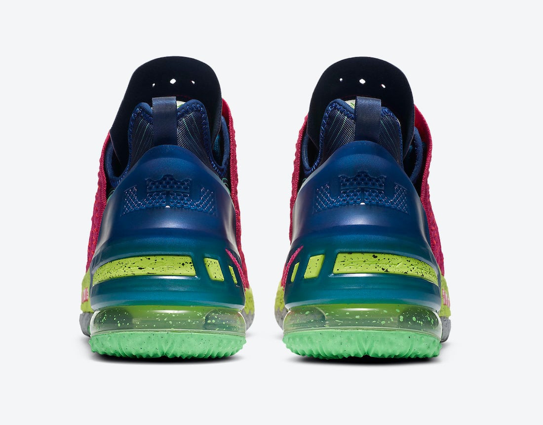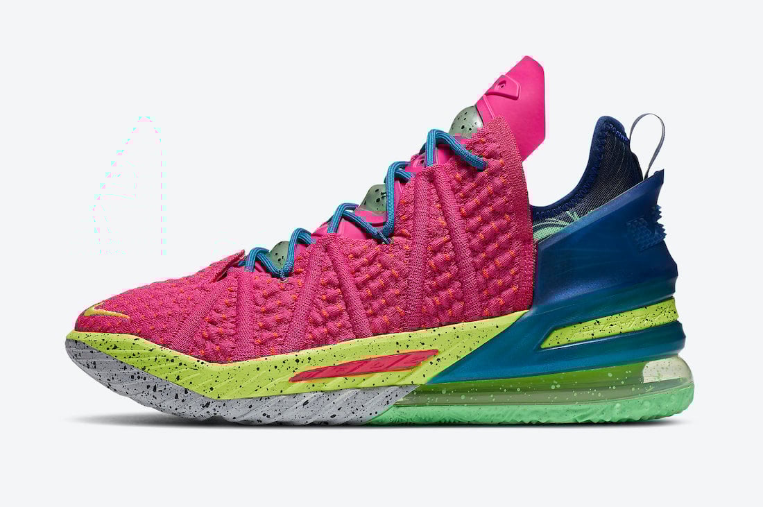 As you can see, this Nike LeBron 18 comes dressed in a Pink Prime and Multicolor color combination. Firstly, Pink Knitposite 2.0 covers the upper while Neon Yellow covers most of the midsole paired with speckled detailing. Blue runs across the heel counter and laces. In addition, Grey pears from the midsole along with more speckled detailing. Finally, Green splatter and the same color on the part of the outsole finishes the look.