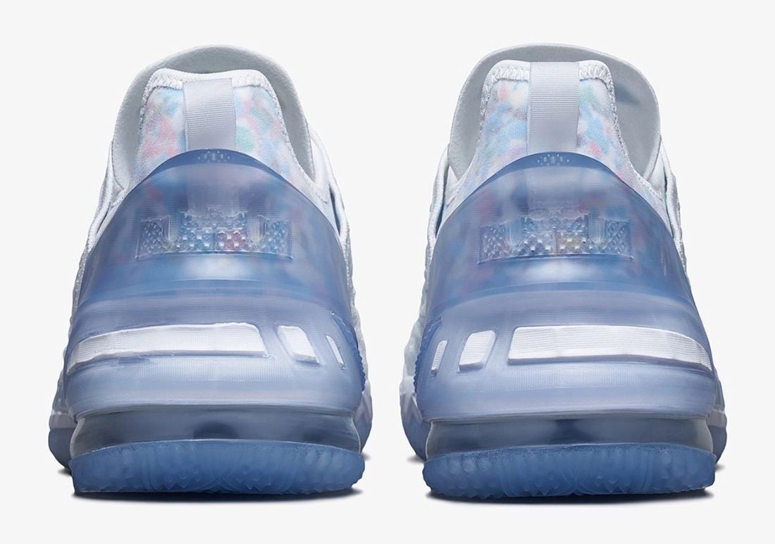 This Nike LeBron 18 comes dressed in a Blue Tint, White, and Clear color combination. Highlighted with White knitting on the upper while the heel counter features an icy translucent. Next, Multicolor forming a unique pattern adorns the tongue and covers the base around the heel. Finally, a translucent rubber outsole finishes the look.