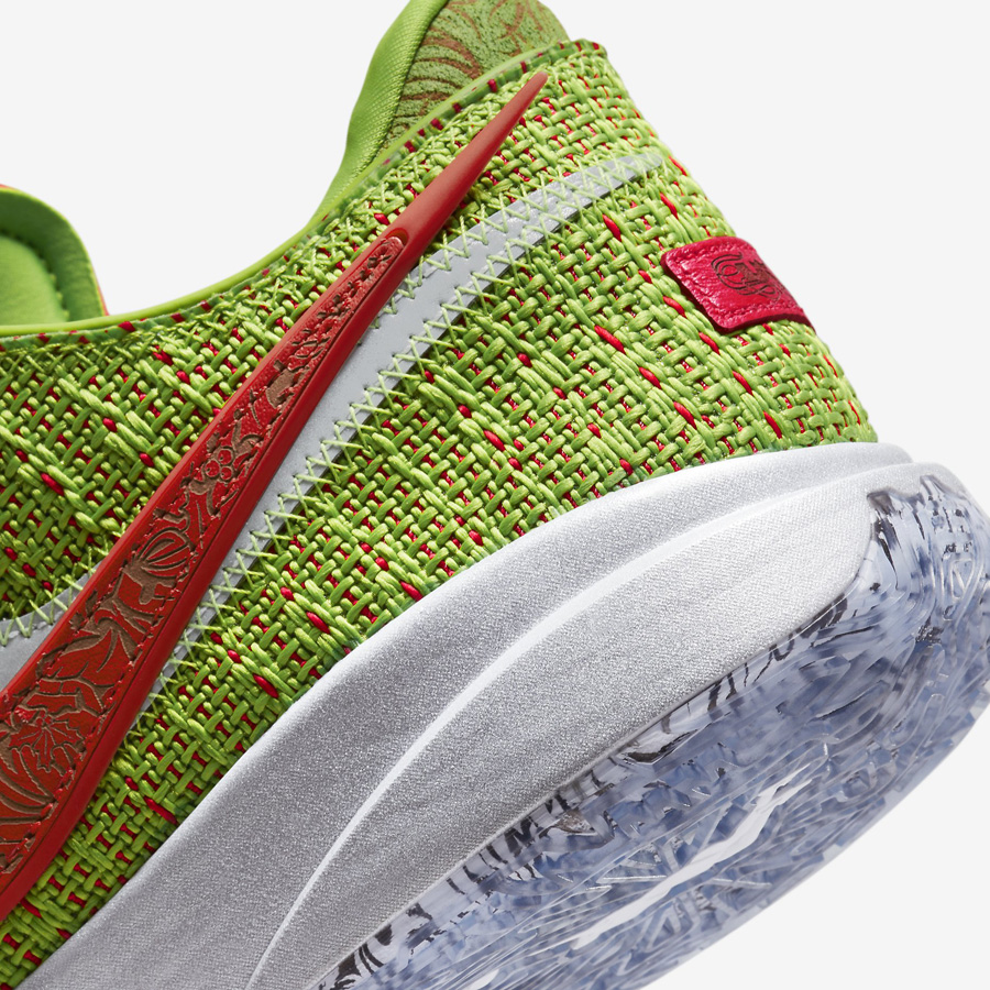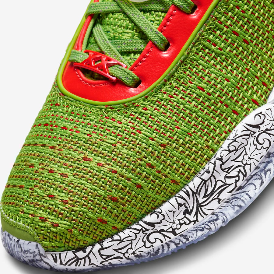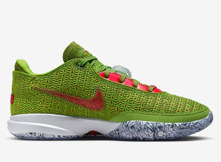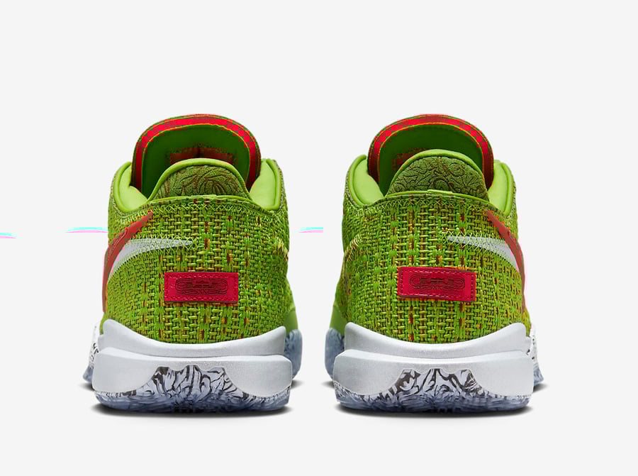 This Nike LeBron 20 features a Green Apple, Reflect Silver, University Red, and Bright Crimson color combination that gives them โGrinchโ vibes. Constructed with a knitted upper covered in Green with Red on the base and the Swoosh logo. Missile toe print adorns the Swoosh logo and wraps part of the midsole, and a unique graphic lands on the insoles. Finishing the look is a translucent outsole that exposes more missile toe prints.