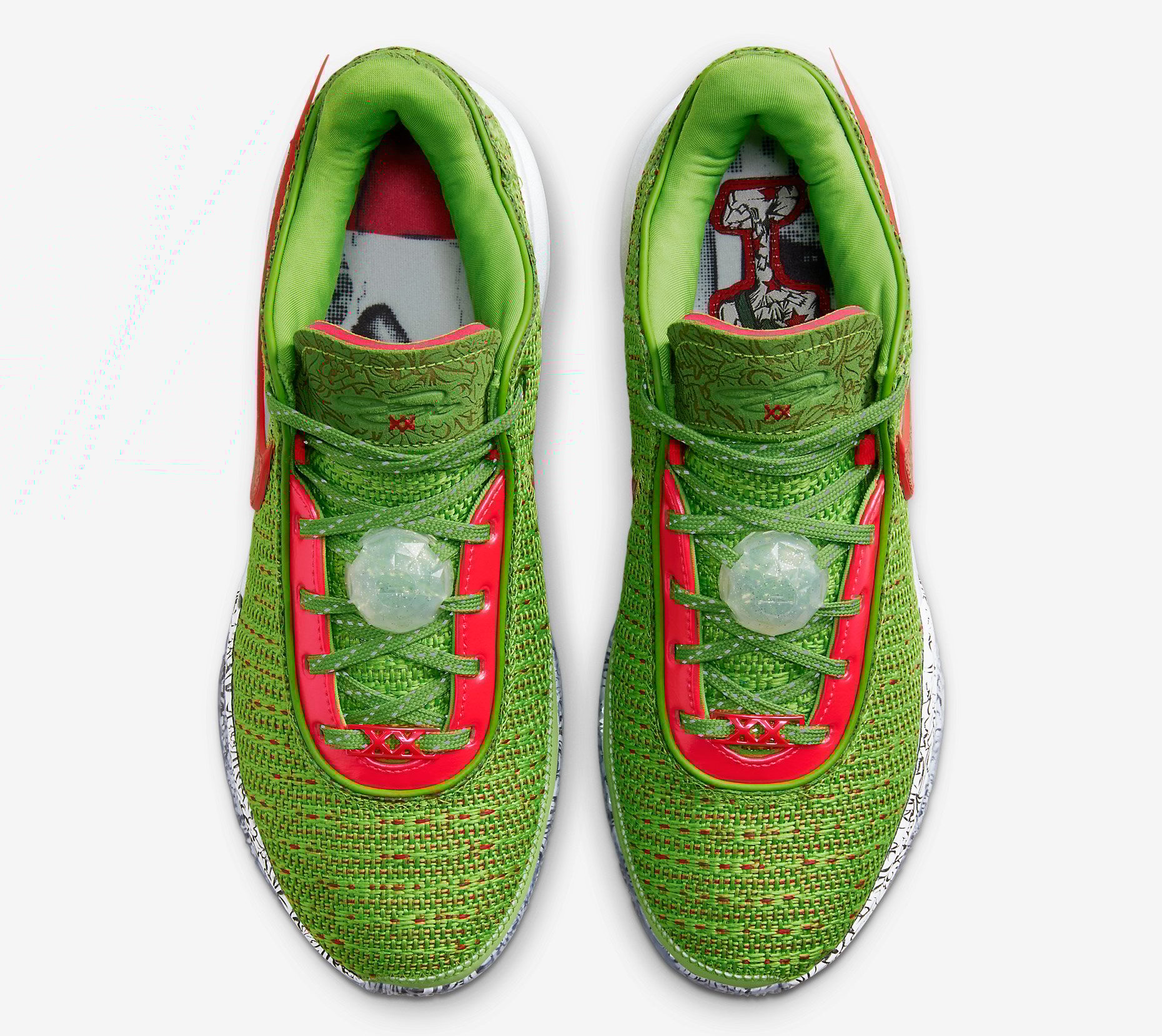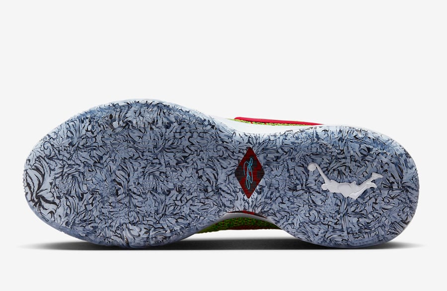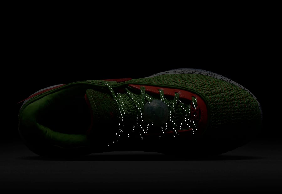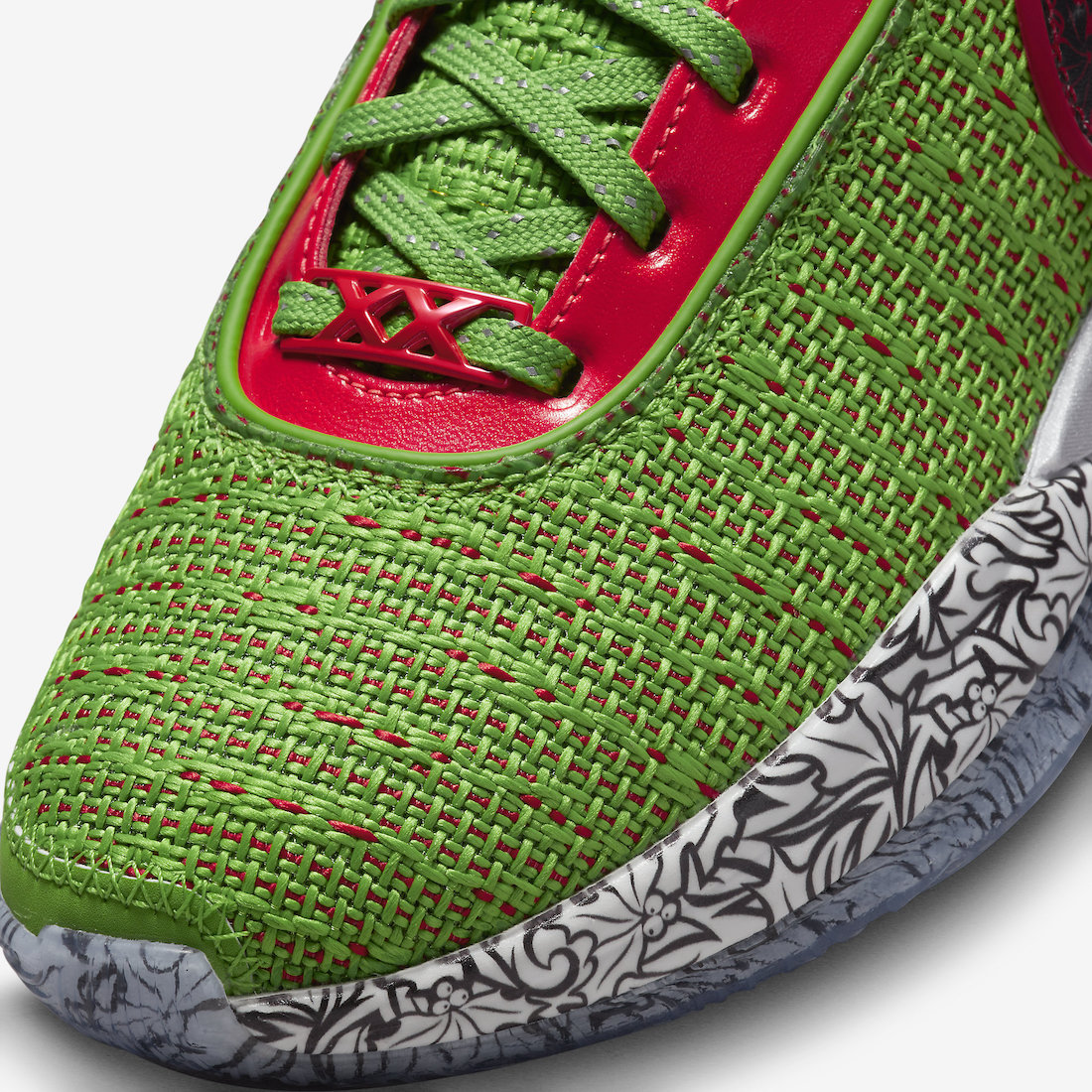This Nike LeBron 20 features a Green Apple, Reflect Silver, University Red, and Bright Crimson color combination that gives them โGrinchโ vibes. Constructed with a knitted upper covered in Green with Red on the base and the Swoosh logo. Missile toe print adorns the Swoosh logo and wraps part of the midsole, and a unique graphic lands on the insoles. Finishing the look is a translucent outsole that exposes more missile toe prints.