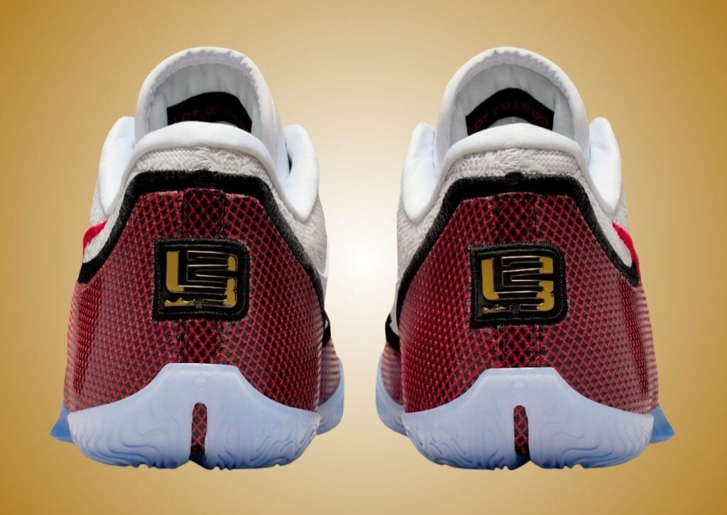 The white and red colorway directly references the Air Zoom Generation “First Game” that LeBron wore on October 29, 2003. That shoe featured a predominantly white leather upper with red accents and a translucent outsole. The Air Zoom Generation was LeBron’s first signature shoe, designed by Aaron Cooper and Eric Avar, and it established design elements that would appear throughout the LeBron line, including visible Zoom Air cushioning and a substantial midfoot support system.