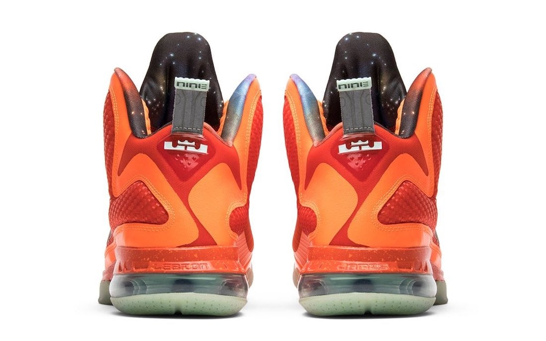 This Nike LeBron 9 features a Total Orange, Reflect Silver, Team Orange, and Mango color combination. Although images of the 2022 edition have yet to leak, the color scheme matches up with the initial launch. Utilizing a Galaxy theme, shades of Orange run throughout the mesh upper while 3M reflective adorns the Swoosh. The pair also features a Galaxy print on the liner and a translucent outsole with glow-in-the-dark detailing.