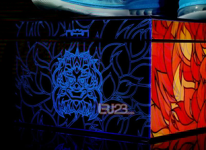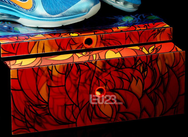Nike and LeBron are going all out to promote the very well recepted Nike LeBron 9 “China”. By ditching the original “China” color combo of Red and White and utilizing Blue and Orange, Nike knows it has produced another huge success. To add extreme exclusivity to the “China”, just 9 Limited Edition Packaging + Shirt “bundles” will be available October 1st midnight, (Beijing, China time) atย Nikestore.com.cn. The first 9 online buyers who successfully complete the entireย nerve-wracking checkout ordeal will be able to claim the Limited Edition Packaging + Shirt bundle. The limited edition slider box is unlike any we have ever seen. With these images we can see that the outside of the slider depicts what seems like dragon scales in Orange, Yellow, and Red. The side panels have dark Blue and Black dragon scales along with the head of the same Chinese stone guardian lion that appeared on the tongue of the Nike LeBron 8 “China”. The top panel of the box has more contrasting colors of scales in Green, Orange, and dark Blue. Lastly, on the back a gold plate that reads “LeBron 9 China Edition” is pressed on to finish up this very impressive piece of art. To add to this incredible packaging, each of the 9 customers will also receive an accompanying “China” T-shirt that has a Black background with LeBron and his new logo and Chinese characters printed in Blue. This limited edition packaging will be very difficult to get your hands on, plan accordingly. Good luck!