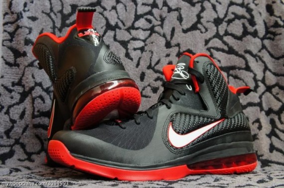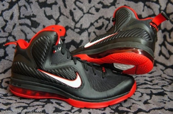 This LeBron 9 features woven, lightweight uppers and Flywire on high silhouette. These synthetic materials ensure maneuverability, durability andย breathability. Some things modern basketball shoes are required to have. The black upper is accent with red and white and placed on top of a 180 air max unit, veering away from the normal 360 air mag, that the LeBron line has been using for their marquee shoe for the past couple years. Let us know if you are copping the ninth installment of what could be his championship shoe.