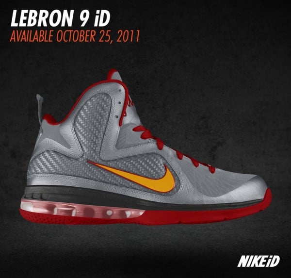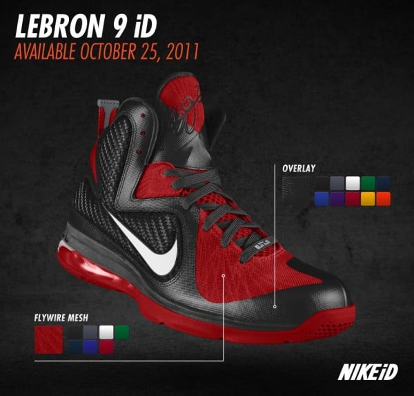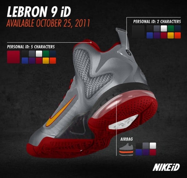 Not too long ago we gave an update on when the Nike LeBron 9 will become available to customize online at Nike iD. On October 11th the Nike iD will give a preview of the all the options for customization. On October 25th, the Nike LeBron 9 will officially be available to customize and purchase for $206. Nike iD has just released some images of some options one can use. Shown in the images, you will be able to change the flywire panel, heel 180 air unit, synthetic overlay, and of course add letters/numbers on the heel.