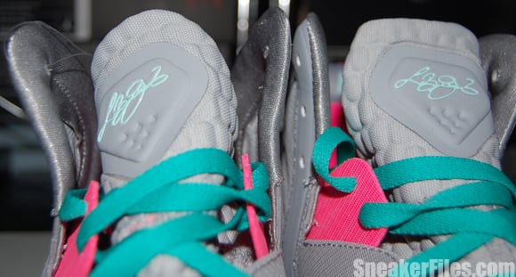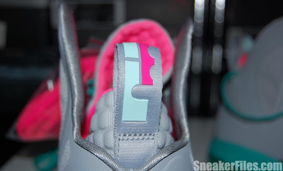 The successor to the original “South Beach” LeBron 8, this new version features aย Wolf Grey/Mint Candy-New Green-Pink Flash colorway with Wolf Grey appearing on the majority of the Hyperfuse upper while Pink Flash accents hit the crown logos, midfoot harness and Kevlar Flywire. Mint Candy takes the Swoosh, tongue signature script and translucent outsole while New Green caps off the look, outlining the medial Swoosh and appearing on the midsole.