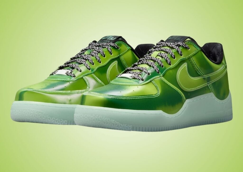 The Nike Air Force 1 Low features a lenticular upper that shifts between shades of Green at different angles, creating a fluid, animated feel. A glow-in-the-dark outsole and illuminated Swoosh outline reshape the shoe in low visibility, while the icy sole replaces traditional “AIR” branding with a GOAT icon.