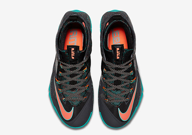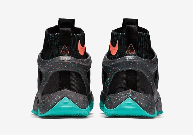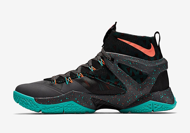 This LeBron Ambassador 8 comes dressed in Black, Hyper Turquoise and Bright Crimson. In addition, the shoes are constructed with Dynamic Flywire and an extended collar. One of the highlights is the mixture of Turquoise and Bright Crimson that is speckled across the midsole and support cage.