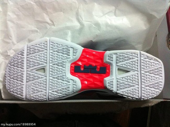 The first model of the LeBron Ambassador 8 to leak comes in a midnight navy, white and university red color scheme, also known as a Team USA theme. Navy will be used on the base while the midsole and heel counter feature white. Red is also seen on the Flywire cables, branding, heel tab and liner. There doesn’t appear to be any USA branding, but the colors used should be enough.