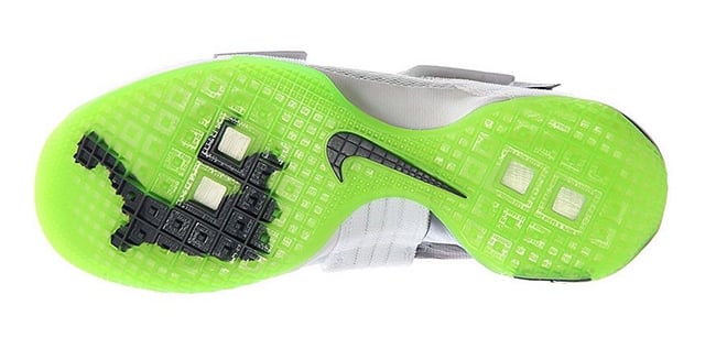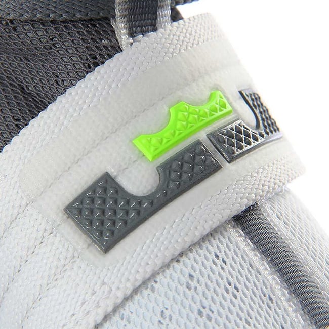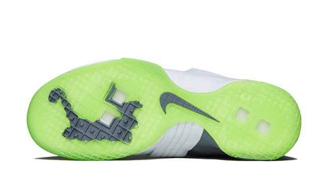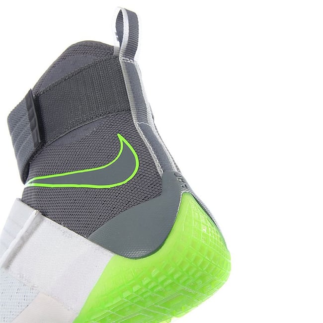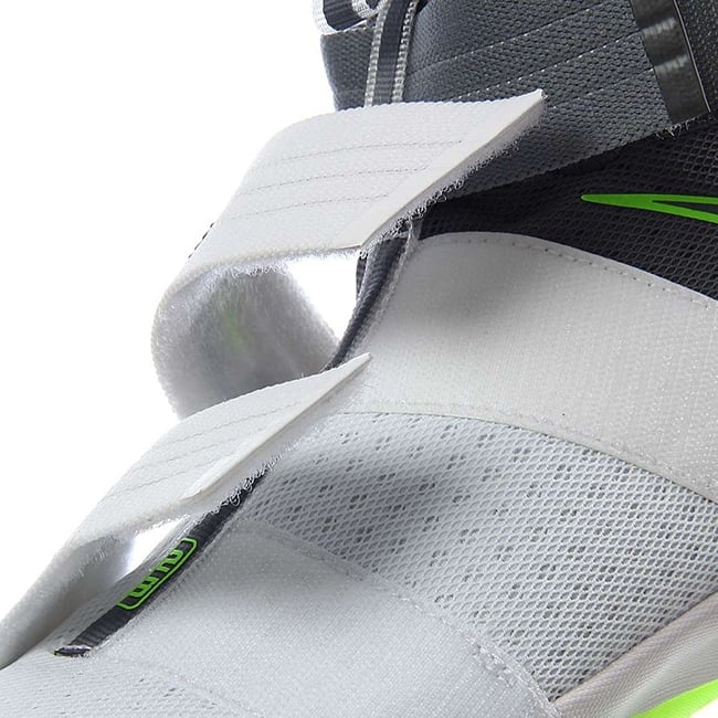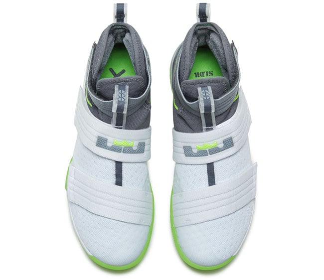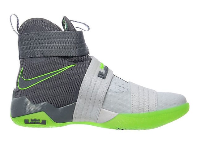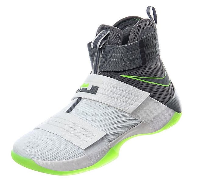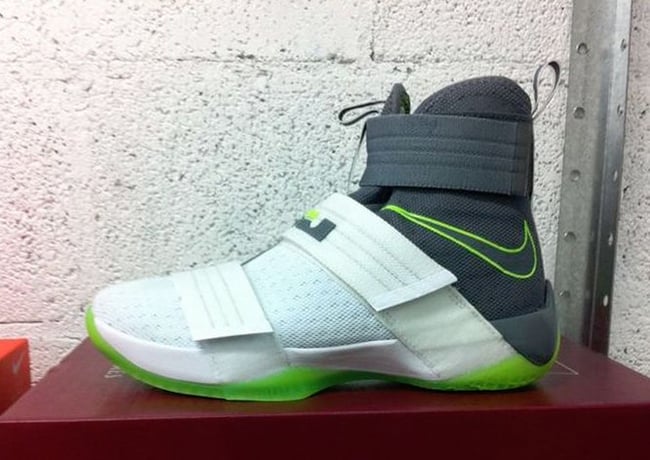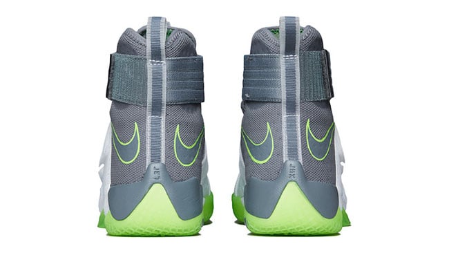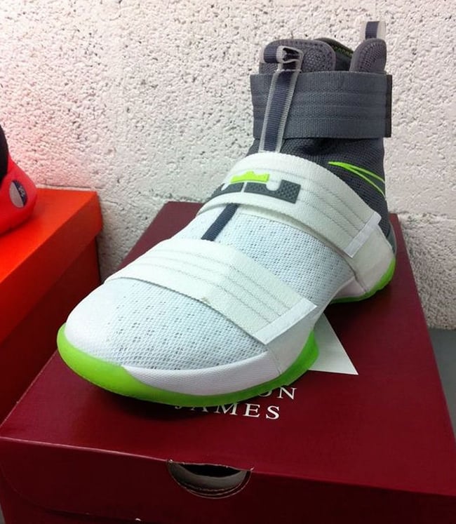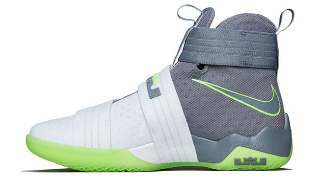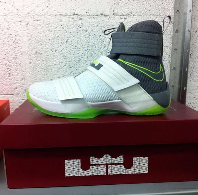 Although it appears the Dunkman branding is not present, the actual color theme is. As you can see, this Nike LeBron Soldier 10 features White through the toe and bottom two straps while the collar, around the heel and ankle strap is done in Grey. Bringing the theme to life is the use of bright Green that lands on the outsole, outlining the Swoosh and hinted on the LBJ branding. On the sole is the Dunkman logo which completes the look.